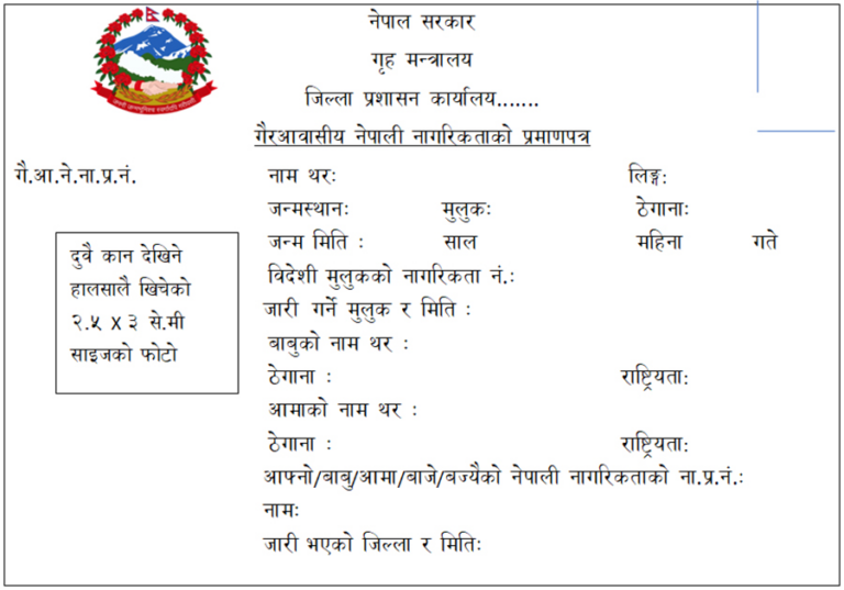 गैर आवासीय नेपालीले नागरिकताका लागि निवेदन दिएपछि नेपाली दूतावास वा महावाणिज्य दूतावासले १५ दिनभित्र सम्बन्धित प्रमुख जिल्ला अधिकारीसमक्ष निवेदन पठाउनुपर्नेछ । यसरी निवेदन आएपछि प्रमुख जिल्ला अधिकारीले ती गैर आवासीय नेपालीलाई चिन्ने एक नेपाली नागरिकले सनाखत गर्नुपर्नेछ ।