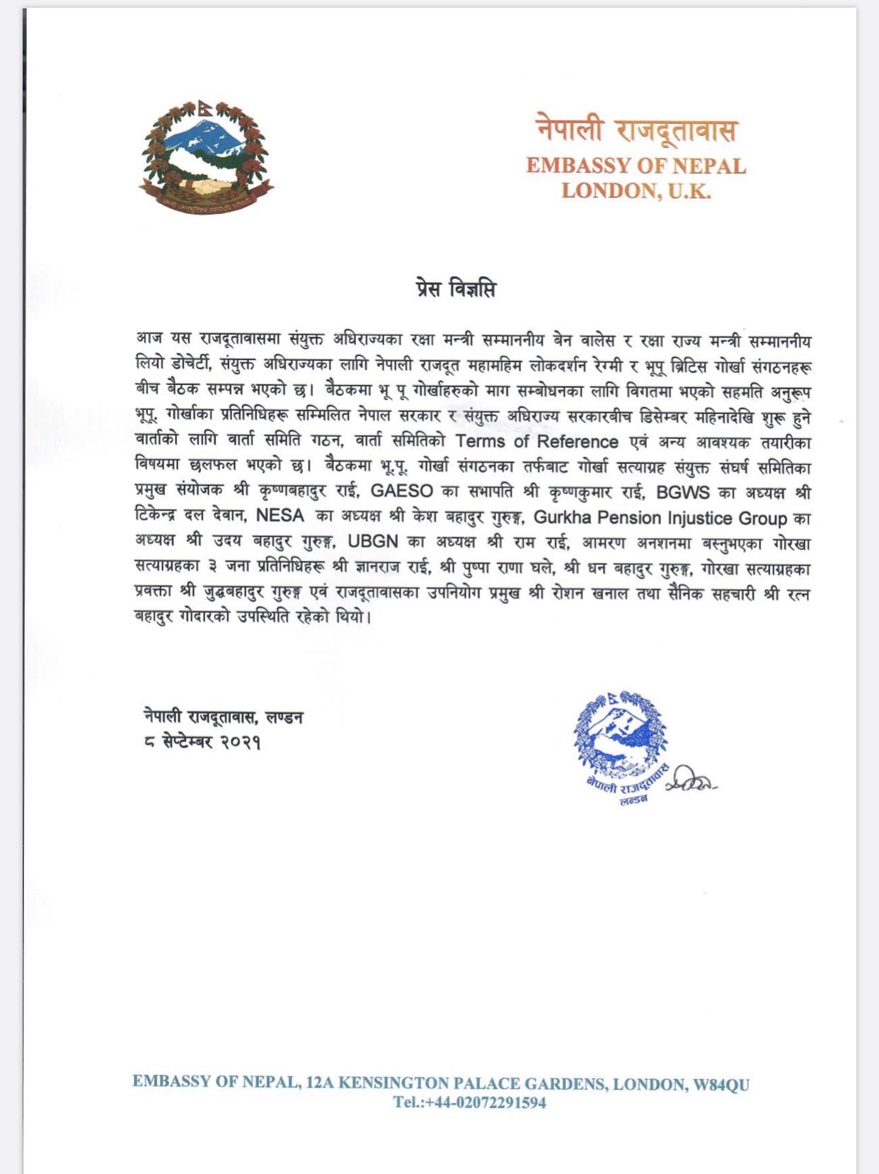 बैठकमा गोर्खाहरुको माग सम्बोधनका लागि आउँदो डिसेम्बर महिनाभित्रै शुरु गर्ने भनिएको वार्ताको तयारीका विषयमा छलफल भएको लन्डनस्थित नेपाली दूतावासले जनाएको छ ।