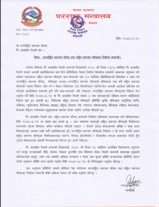 नेपाल सरकार परराष्ट्र मन्त्रालयले गैरआवासीय नेपाली संघ, अन्तर्राष्टिय समन्वय परिषद्लाई सम्बोधन गर्दै भदौ २५ गते जारी गरेको निर्देशन पत्रमा अन्तर्राष्टिय समन्वय परिषद् तथा राष्टिय समन्वय परिषद्का निर्वाचनसम्बन्धी बांकी काम रोक्नू भनिएको छ ।