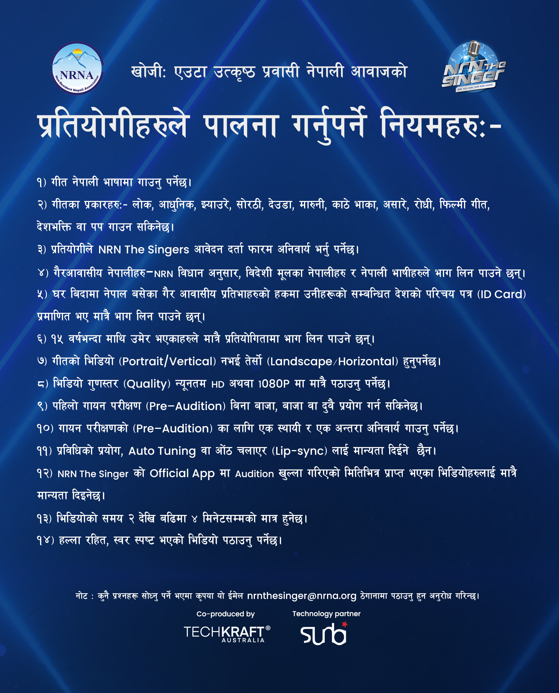 एनआरएनए आइसीसी अन्तर्गत संस्कृति तथा सम्पदा उप-समितिले डायस्पोराका नेपालीभाषी अग्रज र अनुजहरुका स्वर प्रतिभाहरूको पहिचान गर्ने उद्देश्यले टेलिभिजन रियालिटी शो ‘एनआरएन द सिङ्गर’ सुरू गरेको हो।