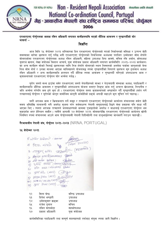 यस्तै अराजक काम र क्रियाकलाप गर्ने समुह र तत्वहरुले एनआरएनए पोर्चुगलको कार्यालय संचालनमा समेत केही समय अघिदेखि तालाबन्दी गरी अवरोध सृजना गरेर सर्वसाधारण नेपाली समुदायलाई दिइने सेवा प्रवाहमा पनि बाधा गर्दै आएका थिए । यस्ता अराजक तत्वहरुले जनसाधारणको काममा पुर्याइरहेको अवरोध र बाधालाइ एनआरएनए पोर्चुगल अब मुकदर्शक भएर हेरिरहन सक्दैन । त्यसैले आगामी २७ सेप्टेम्बर २०२१ सोमबारदेखि एनआरएनए पोर्चुगलको कार्यालय खोली नियमित रूपमा संचालनमा आउने आम पोर्चुगलबासी नेपाली दिदिबहिनी तथा दाजुभाइहरुमा जानकारी गराउन चाहन्छौं ।