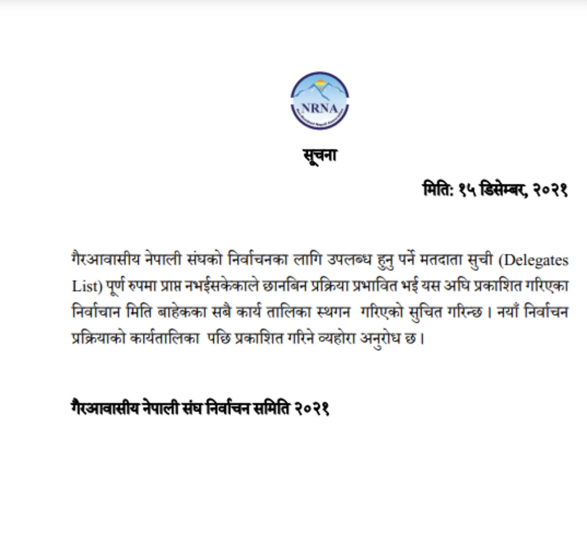 यसअघि यही डिसेम्बर २६ र २७ तारिखका लागि निर्वाचन गर्ने कार्यतालिका सार्वजनिक गरिएको थियो । निर्वाचन समितिले निर्वाचनको लागि आवश्यक मतदाता सूची पूर्ण रुपमा उपलब्ध भइनसकेकाले यसअघि प्रकाशित कार्यतालिका स्थगन गरिएको जनाएको छ ।