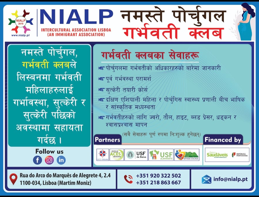 नमस्ते पोर्चुगल परियोजना अन्तर्गत ‘गर्भवती क्लब’ नाम दिएर पोर्चुगलमा रहेका नेपाल, भारत, बंगलादेश, पाकिस्तान लगायत दक्षिणी एसियाली देशका गर्भवती महिलाहरूलाई निशुल्क स्वास्थ्य सेवाको कार्यक्रम डिसेम्बर दोस्रो सातादेखि सुरु भइसकेको निर्देशक भट्टराईले जानकारी दिए ।