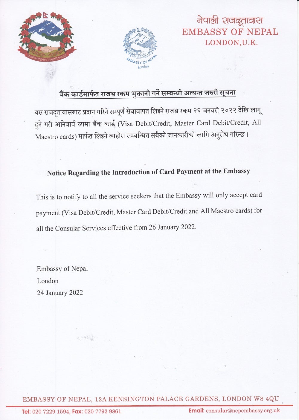 दूतावासबाट प्रदान गरिने सम्पूर्ण सेवावापत लिइने राजश्व रकम २६ जनवरी देखि लागू हुने गरी अनिवार्य रुपमा बैंक कार्ड मार्फत लिइने दूतावासले जनाएको छ ।