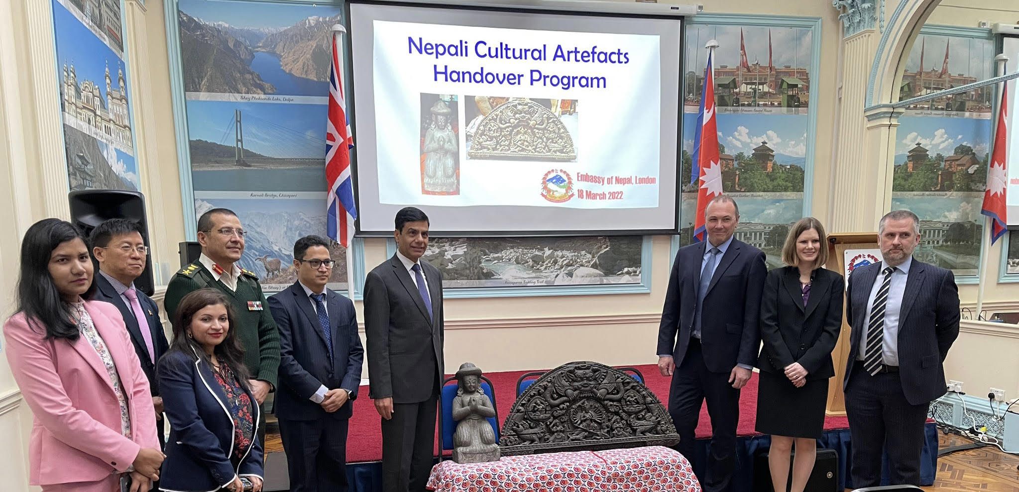 लन्डन । सन् १९८० देखि १९९० को दशकमा काठमाडौंबाट हराएर बेलायतमा भेटिएका दुई मूर्ति बेलायत सरकारले नेपाल सरकारलाई हस्तान्तरण गरेको छ । नेपाली दूतावास लण्डनमा शुक्रबार आयोजित एक विशेष समारोहबीच लन्डन मेट्रोपोलिटन प्रहरीका डिटेक्टिभ सुपरिटेन्डेन्ट जोन रोचले राजदूत ज्ञानचन्द्र आचार्यलाई हस्तान्तरण गरेका हुन् ।