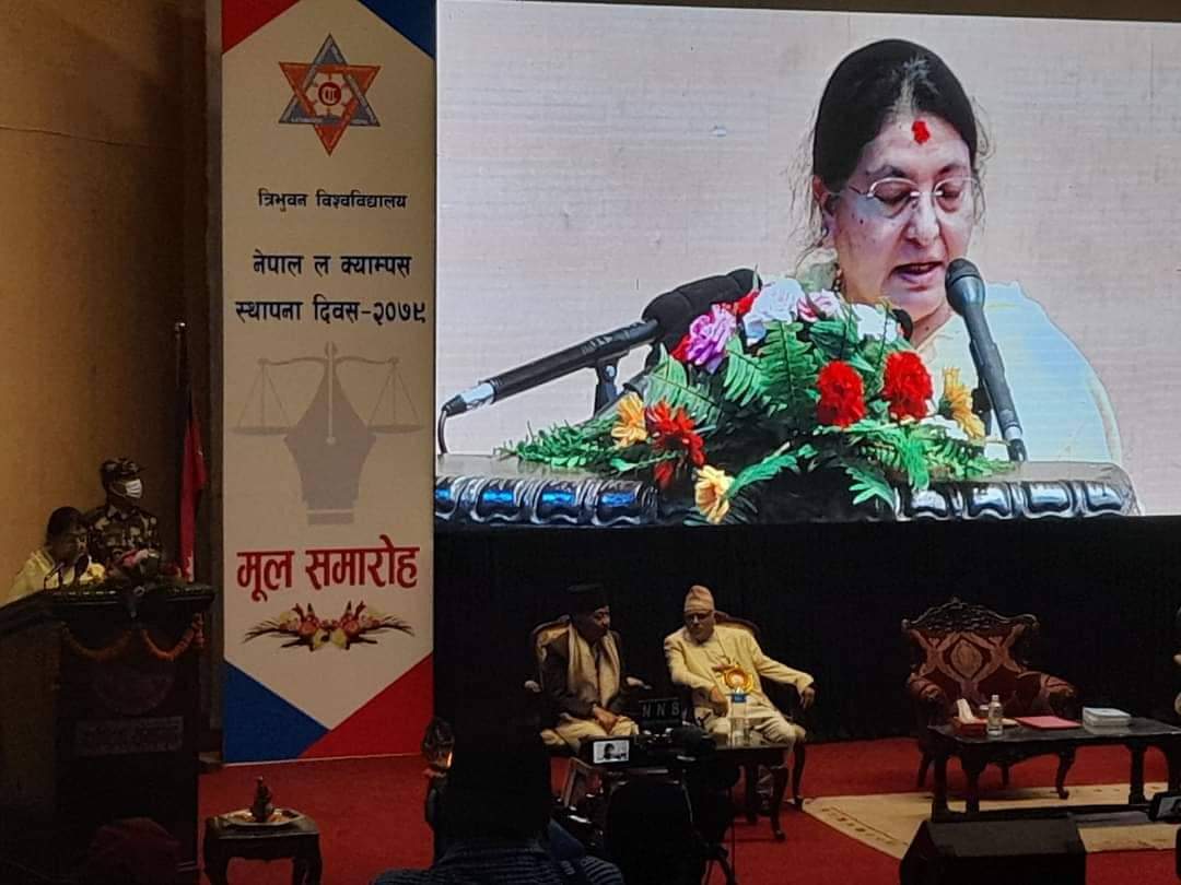 नेपाल ल क्याम्पसको स्थापना दिवस समारोहमा बोल्दै राष्ट्रपति भण्डारीले विश्वविद्यालयका प्राध्यापक र विद्यार्थीहरूले संविधान र कानुनको बारेमा समाजमा जनचेतना अभिवृद्धि गर्न भूमिका खेल्नुपर्ने बताइन् ।