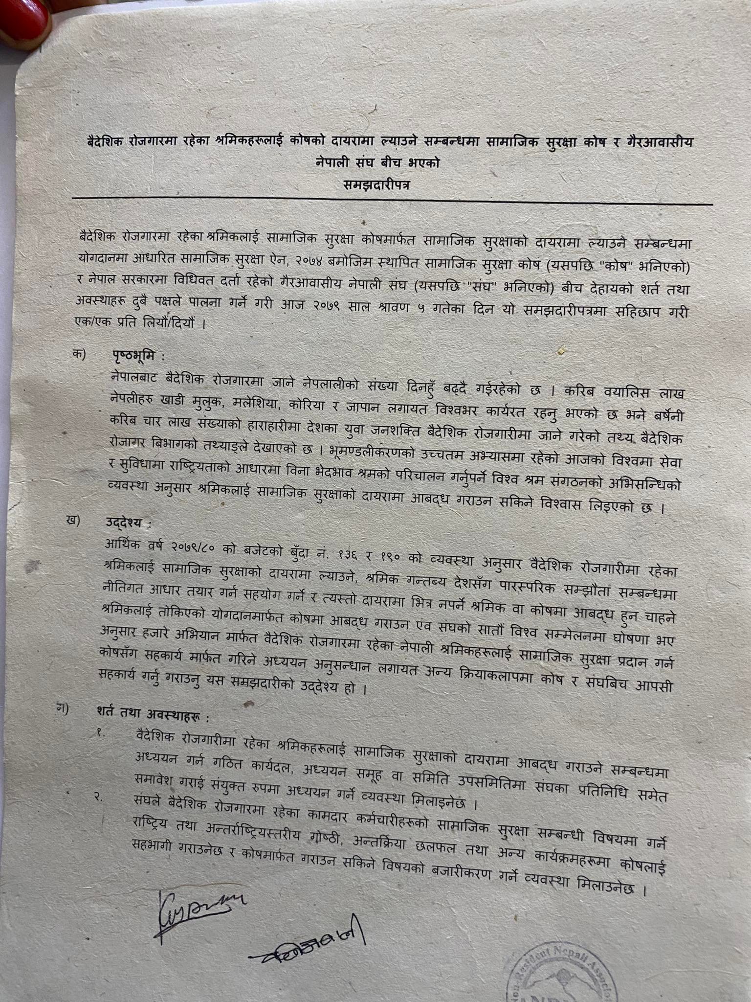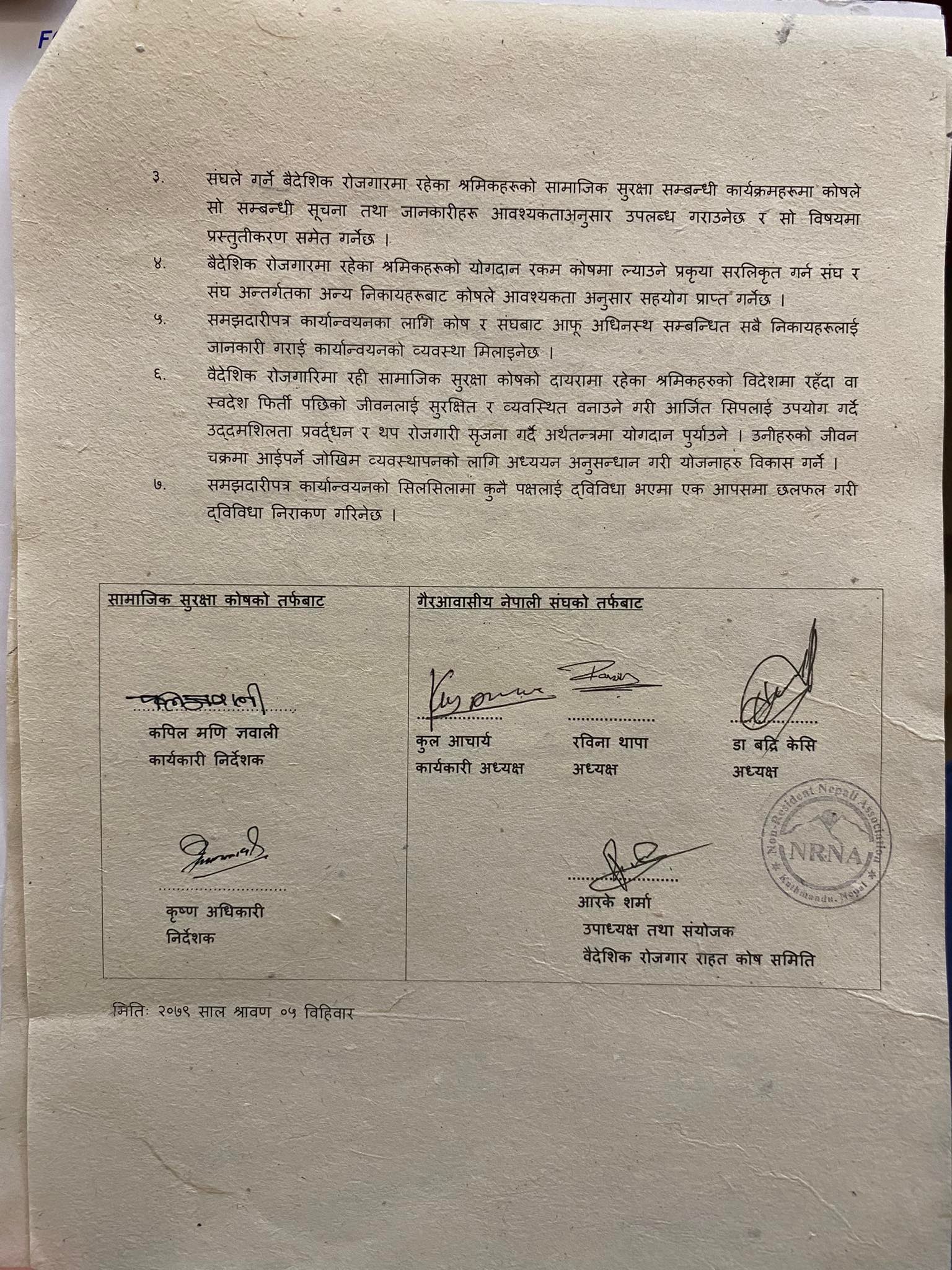 सो पत्रमा सामाजिक सुरक्षा कोषका तर्फबाट कायकारी निर्देशक कपिल मणि ज्ञवाली र संघका अध्यक्षहरु डा. बद्री केसी, रविना थापा, कुल आचार्य र वैदेशिक रोजगार राहत कोषका संयोजक आरके शर्माको हस्ताक्षर रहेको छ ।