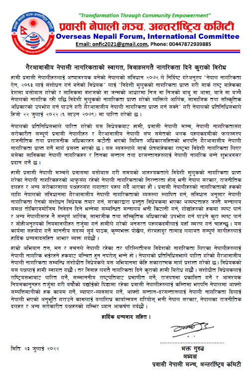 ‘नेपालको प्रतिनिधिसभाले पारित गरेको गैरआवासीय नेपाली नागरिकता सम्बन्धि संशोधित विधेयकले यस अभियानमा केहि सकारात्मक मार्ग प्रशस्त गरेको छ। विधेयकको यस पक्षलाई हामी स्वागत गर्छौ। तर विवाहलगतै नागरिकता दिने कुराको हामी बिरोध गर्छौ, वक्तव्यमा भनिएको छ, ‘संशोधित विधेयकलाई राष्ट्रियसभाबाट पारित गर्ने, सम्माननीय राष्ट्रपतिबाट प्रमाणीत गर्ने, राजपत्रमा प्रकासित गर्ने र आवश्यक नियमकानुनहरु तर्जुमा गरी बर्षौको पर्खाईको पिडामा रहेका प्रवासी नेपालीहरुलाई कम्तिमा भएपनि नेपालमा आफ्नो सम्पत्तिमाथीको हक कायम गर्ने, व्यापार–व्यवसाय गर्ने, आफ्नो सन्तान–दरसन्तानलाई नेपाली नागरिकता दिलाई नेपाली भएको अनुभूति गराउने कामलाई यथाशिघ्र कार्यान्वयन गरियोस् भनी नेपाल सरकार, नेपालका राजनीतिक दलहरु र अन्य सरोकारीत पक्षहरुको गम्भिर ध्यान आकर्षण गर्दछौं ।’