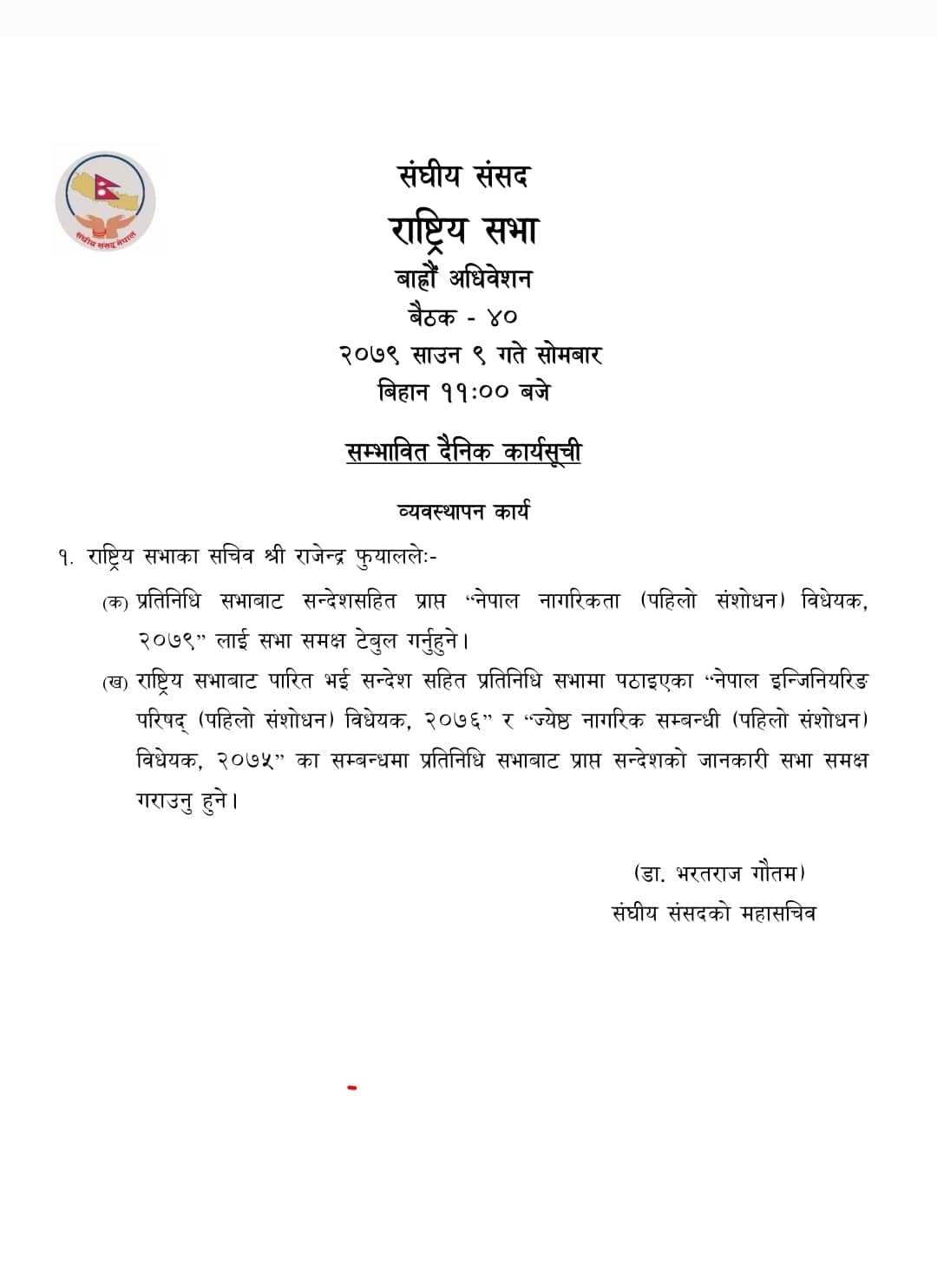 सो विधेयक प्रतिनिधिसभाबाट पारित भइसकेको छ। त्यस्तै आजको बैठकमा राष्ट्रिय सभाबाट पारित भई सन्देश सहित प्रतिनिधि सभामा पठाइएका ‘नेपाल इन्जिनियरिङ परिषद् (पहिलो संशोधन) विधेयक २०७६’ र ‘ज्येष्ठ नागरिक सम्बन्धी (पहिलो संशोधन) विधेयक, २०७५’ का सम्बन्धमा प्रतिनिधि सभाबाट प्राप्त सन्देशको जानकारी सभालाई गराइनेछ।