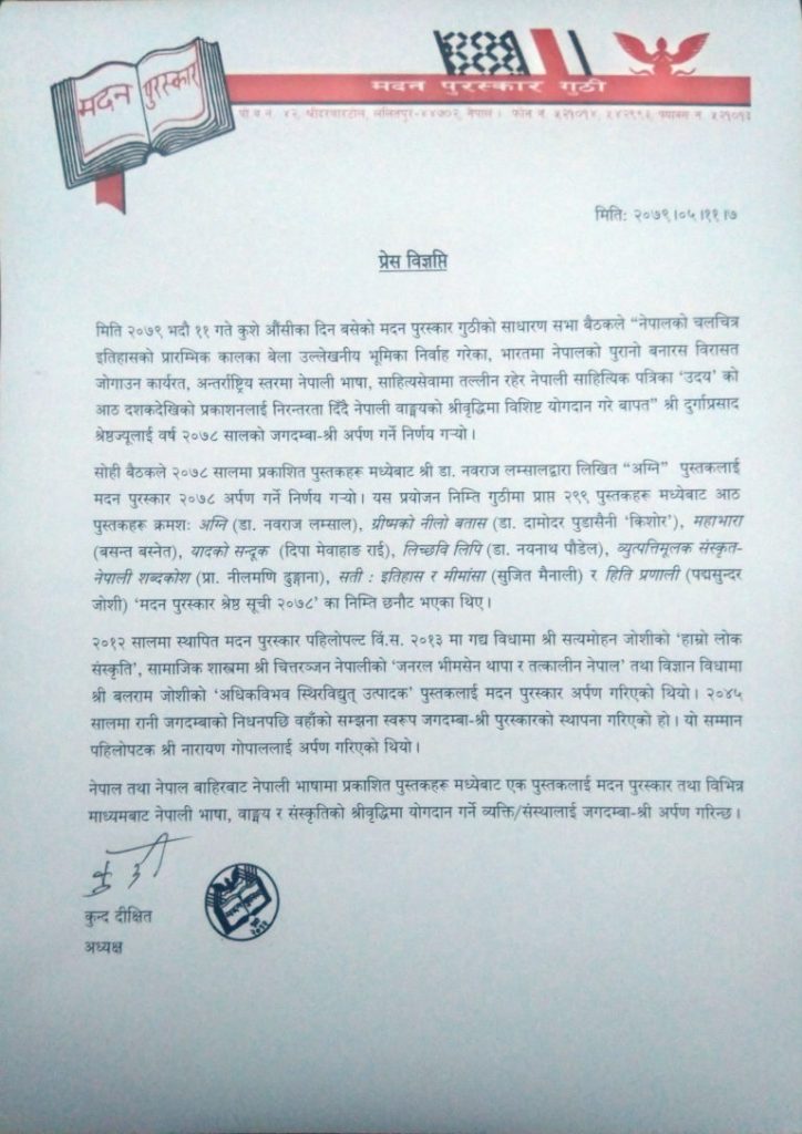 काठमाडौं । २०७८ सालको मदन पुरस्कार डा. नवराज लम्सालको पुस्तक ‘अग्नि’ले पाएको छ । मदन पुरस्कार गुठीको शनिबार बसेको बैठकले अग्निलाई मदन पुरस्कार प्रदान गर्ने निर्णय गरेको गुठीका अध्यक्ष कुन्द दीक्षितले जानकारी दिनुभयो ।
