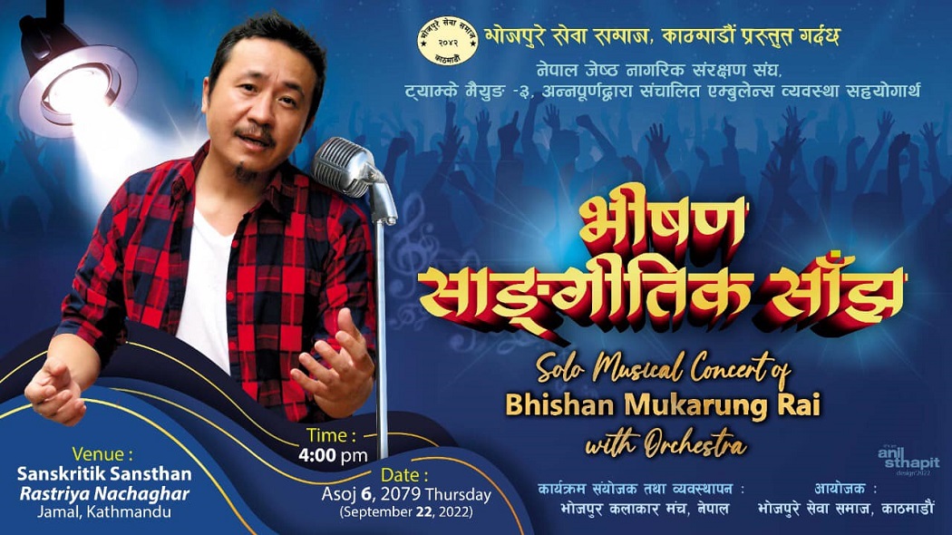 काठमाडौं । एम्बुलेन्स संचालन सहयोगार्थ चर्चित गायक भिषण मुकारुङको एकल साँझ हुने भएको छ। असोज ६ गते बिहीबार सांगीतिक साँझ गर्न लागिएको हो। भोजपुरे सेवा समाज काठमाडौंले एकल साँझको आयोजना गर्न लागेको हो ।