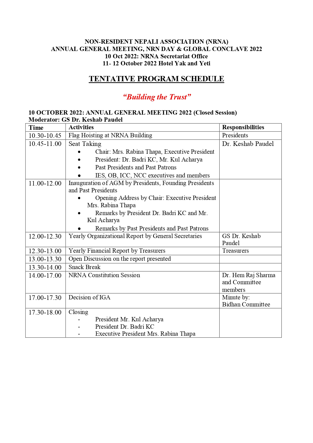 साधारणसभामा संघका महासचिवद्धय गौरीराज जोशी र डा. केशव पौडेलले वार्षिक प्रतिवेदन, कोषाध्यक्षहरुले आर्थिक प्रतिवेदन तथा संघको विधान समितिका संयोजक डा. हेम राज शर्माले विधान प्रतिवेदन पेश गर्ने भएका छन् ।