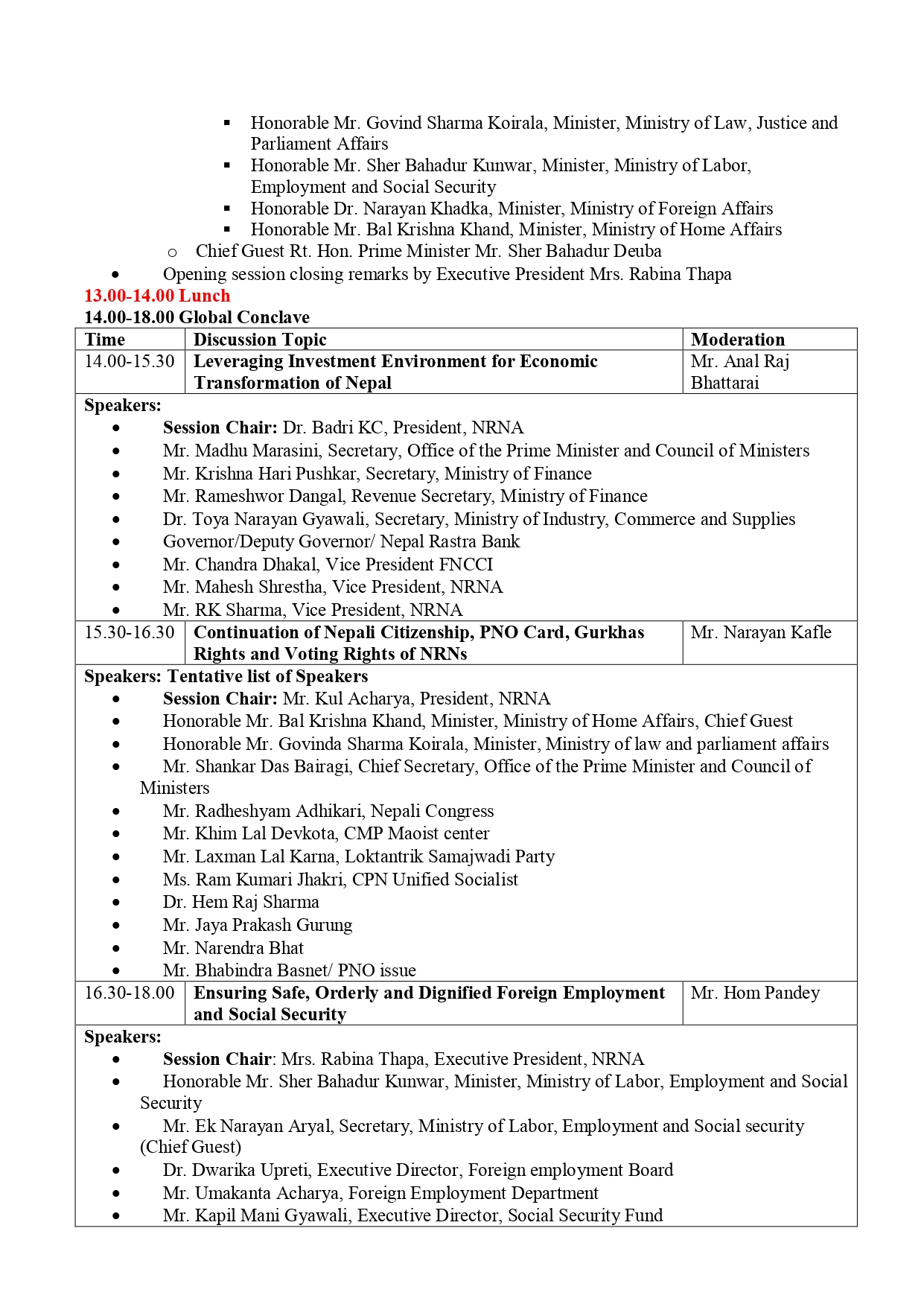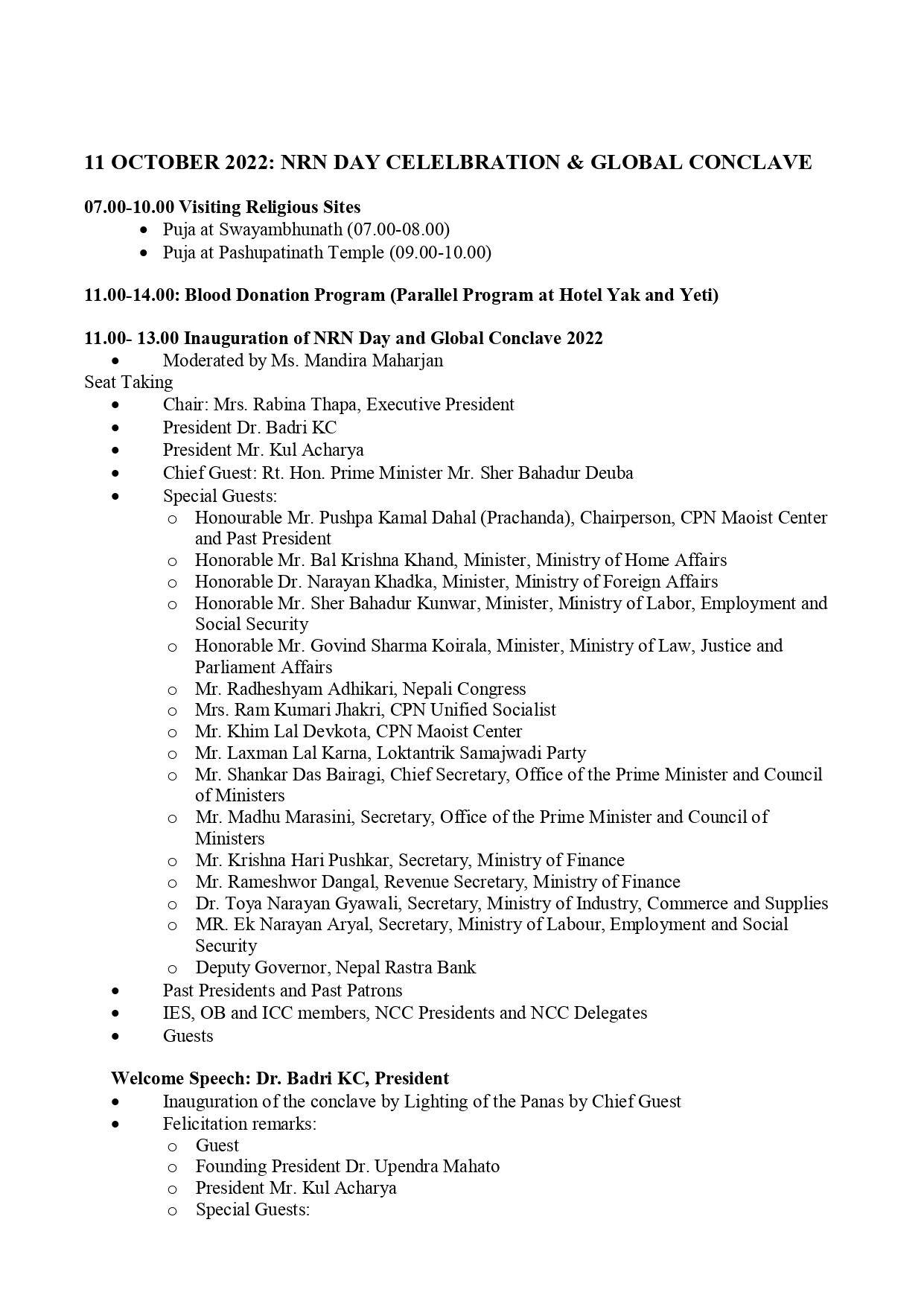 गैरआवासीय नेपाली संघका उपमहासचिव रामशरण सिमखडाका अनुसार सो समारोहको उद्धघाटन प्रधानमन्त्री शेर बहादुर देउवाले गर्ने भएका छन् । सोही समारोहलाई नेकपा माओवादीका अध्यक्ष पुष्पकमल दाहालले सम्बोधन गर्ने भएका छन् ।