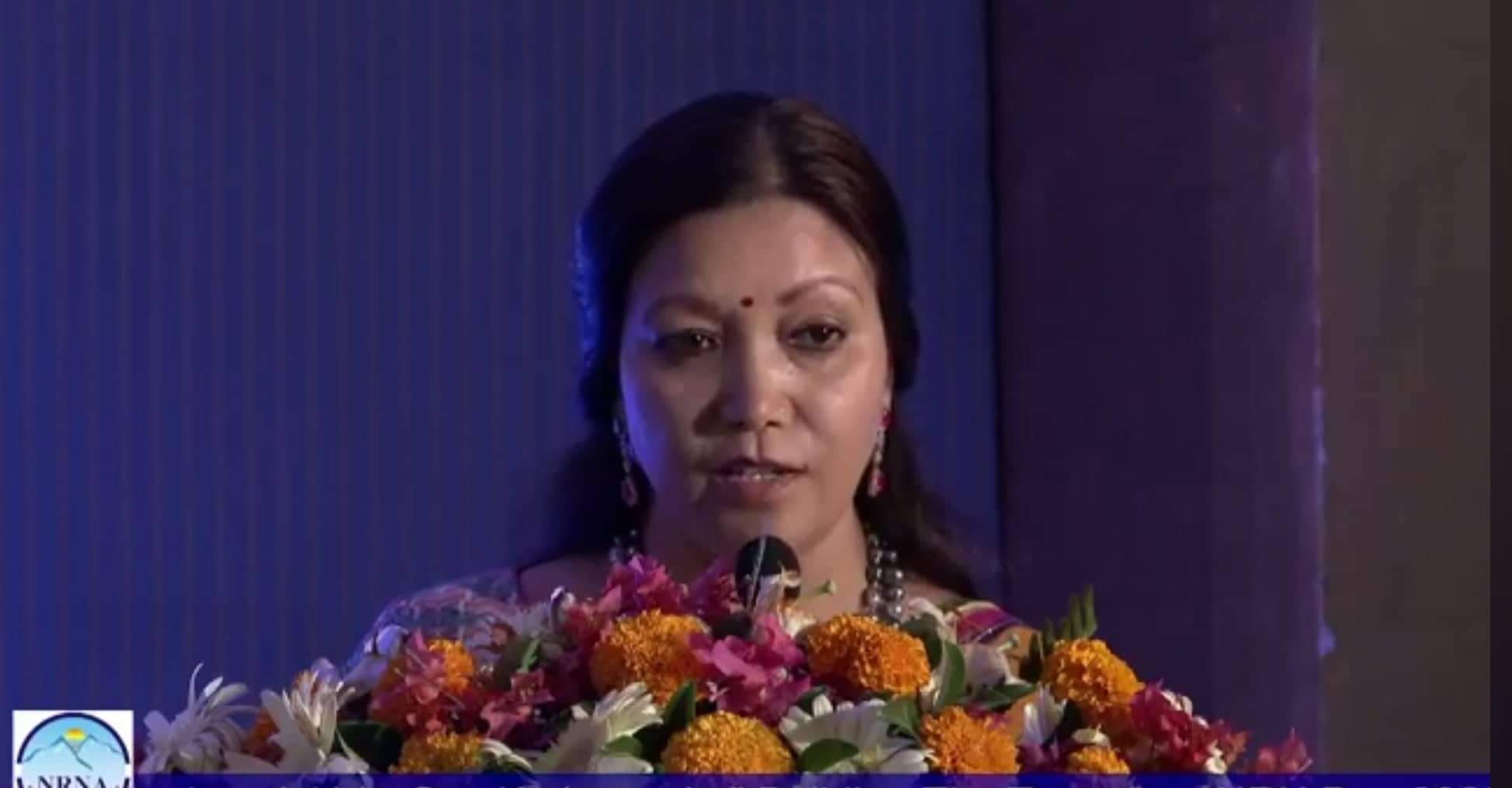 संघको २० औं वार्षिकोत्सवको अवसरमा राजधानीमा आयोजित कार्यक्रमलाई सम्बोधन गर्दै अध्यक्ष थापाले नेपाल देशलाई एनआरएनएले संसारभर चिनाउन भूमिका खेलिरहेको बताएकी हुन्। झएनआरएनएको संजाल संसारभर छ। नेपाल देश भनेर थाहा नहुनेहरुले पनि एनआरएनएको माध्यमबाट नेपालबारे जानकारी पाएका छन् उनले भनिन्।