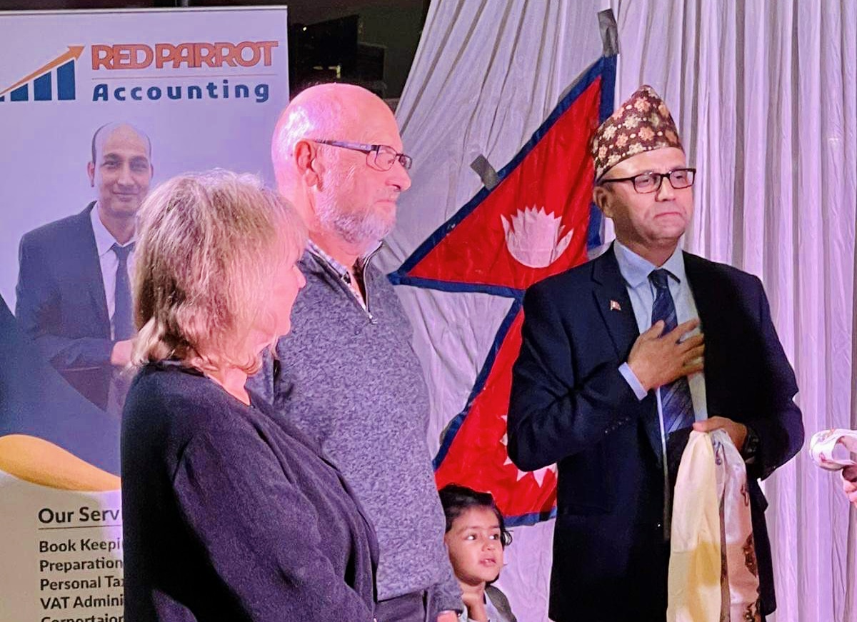 पिटरबरो नेपाली समाजका निवर्तमान अध्यक्ष भरत पाण्डेले विशेष अतिथि पल ब्रिस्टो, कासिन अध्यक्ष प्याट्रिक र लिजलाई नेपाली टोपी र खादाले सम्मान गरेका थिए।