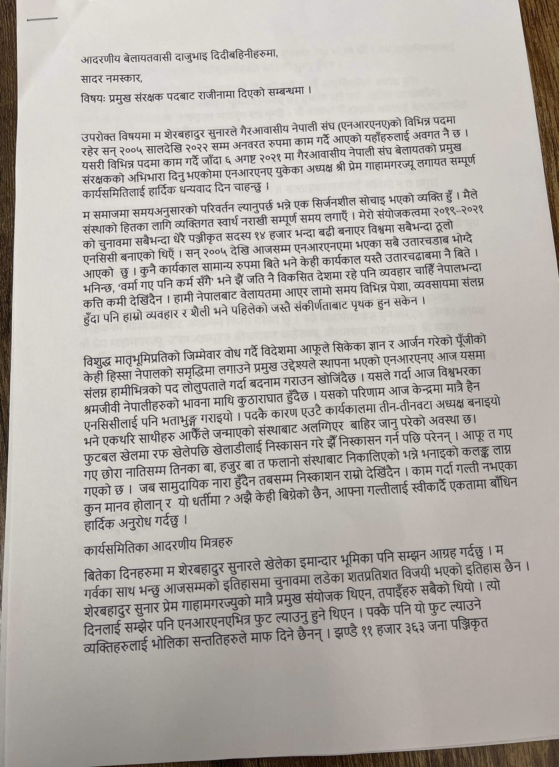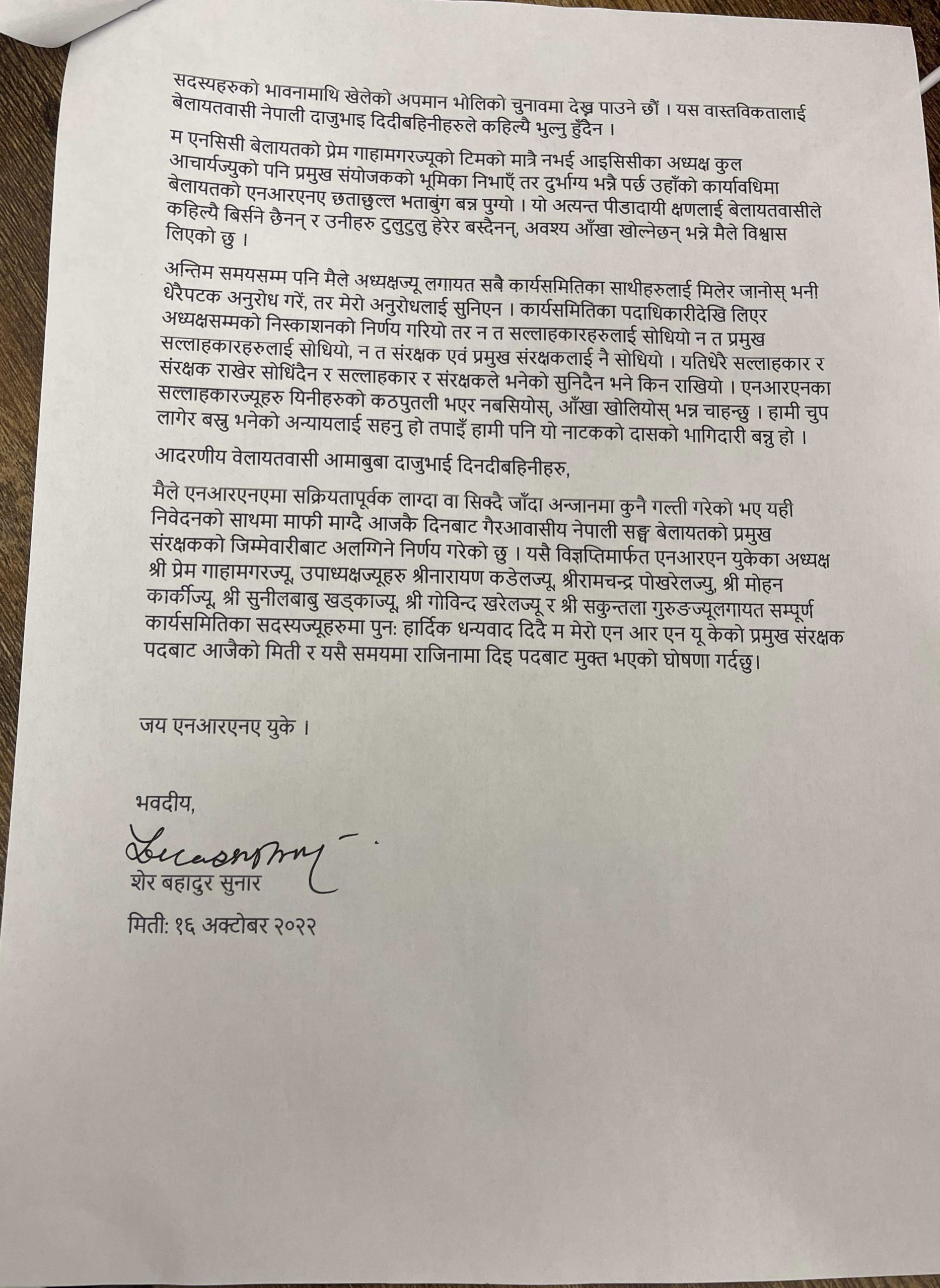 राजीनामा वक्तव्यमा सुनारले एनसीसी बेलायतका अध्यक्ष प्रेम गाहामगर र आइसीसी अध्यक्ष कुल आचार्य दुवैको चुनावी कमाण्डरका रुपमा आफू मैदानमा खटिएको स्मरण गरेका छन् ।