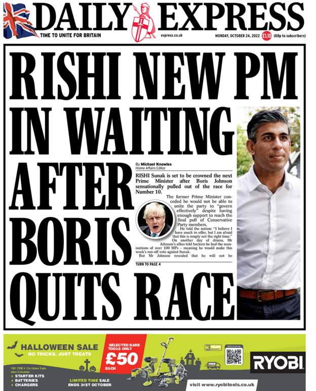 द डेली एक्सप्रेसले बोरिस जोनसनले नम्बर १० को दौडबाट बाहिरिएपछि उनलाई अर्को प्रधानमन्त्रीको ताज लगाउने तयारी भएको बताएको छ।