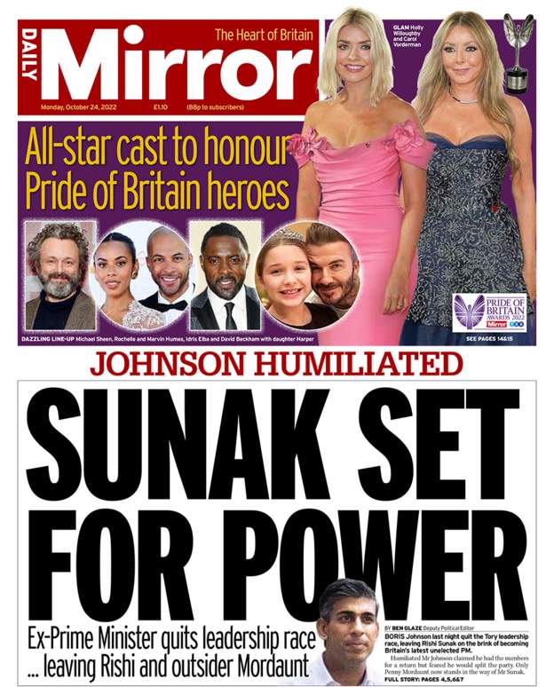डेली मिररले सुनाक बेलायतको पछिल्लो अनिर्वाचित प्रधानमन्त्री बन्ने रिपोर्ट गरेको छ।
