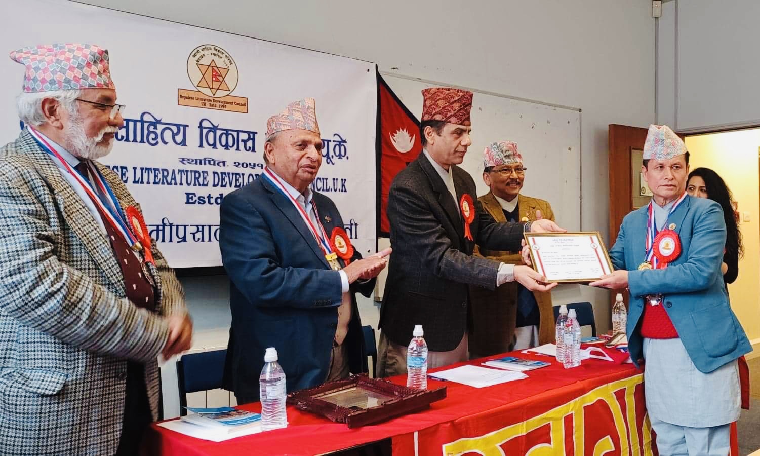 समारोहमा राजदूत आचार्यले नेपालबाट नइ प्रकाशनको रजत महोत्सवका अवसरमा बेलायतका सर्जकहरू कृष्ण बजगाँई, विजय हितान, घनबहादुर थापा मगर, सन्जु बजगाँई, वसन्त रायक्षेत्री, कोमल प्रसाद श्रेष्ठ मल्ल र सुरेशजङ्ग शाहलाई नइ रजत महोत्सव पदक तथा प्रमाण-पत्र प्रदान गरे ।
