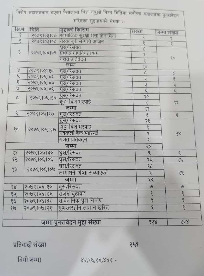 राजश्व चुहावट, घुस, सामाजिक सुरक्षाभत्ता हिनामिना, गैरकानुनी सम्पत्ति आर्जन, प्रश्नपत्र गोपनीयता भंग, गलत प्रतिवेदन, झुट्टा बिल भरपाई, नक्कली बैंक ग्यारेन्टी, गुणस्तरीयहीन सामान खरिद लगायत आरोपका मुद्दामा विशेष अदालतबाट सफाइ पाएका उक्त मुद्दालाई पुनरावेदनका लागि आयोग सर्वाेच्च अदालत गएको हो ।