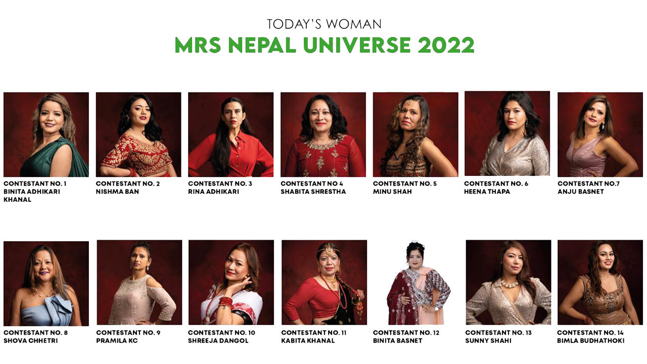 सुन्दरीहरुमा बिनिता बस्नेत, रिना अधिकारी, सन्नी शाही, विनिता अधिकारी खनाल, शविता श्रेष्ठ, विमला बुढाथोकी, मिनु शाह, अन्जु बस्नेत, हिना थापा, प्रमिला केसी, निश्मा बन, श्रीजा डंगोल, कविता खनाल र शोभा क्षेत्री लगायत छन् । प्रतियोगीताको तैयारी र अन्य व्यवस्थापकिय कामहरु अहिले चलिरहेको छ । मिसेस् नेपाल युनिभर्स वीनरले बुल्गेरियामा हुने ४५ औं मिसेस् युनिभर्समा सहभागिता जनाउन सक्ने डंगोलले बताइन् ।