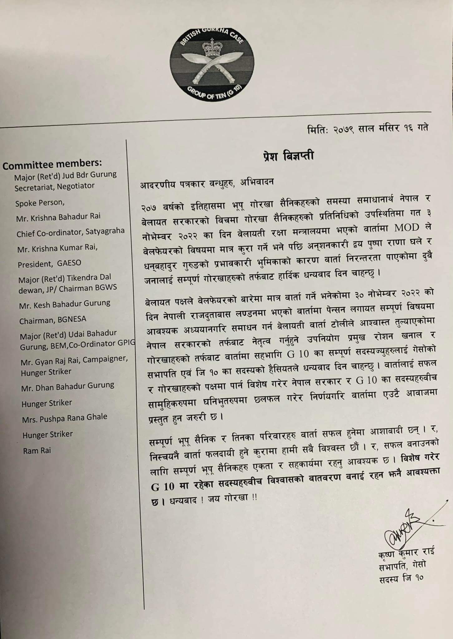 गेसो केन्द्रीय सभापति कृष्णकुमार राईले शुक्रबार एक वक्तव्य जारी गर्दै बेलायतले टार्न खोजेको पेन्सन मुद्धा गोर्खा अभियन्ताहरुको पहलमा वार्ताको टेबलमा आएकोमा प्रसन्नता व्यक्त गरेका छन्।