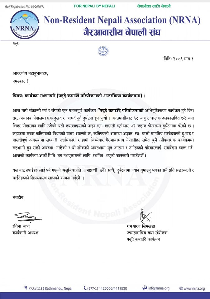 लण्डन् । काठमाडौंबाट ६८ जना यात्रु लिएर पोखराका लागि उडेको यती एयरलाइन्सको एएनसी एटीआर ७२ जहाज दुर्घटना पछि गैरआवासीय नेपाली संघले आफ्ना सबै औपाचारिक कार्यक्रमहरु स्थगित गरेको छ ।