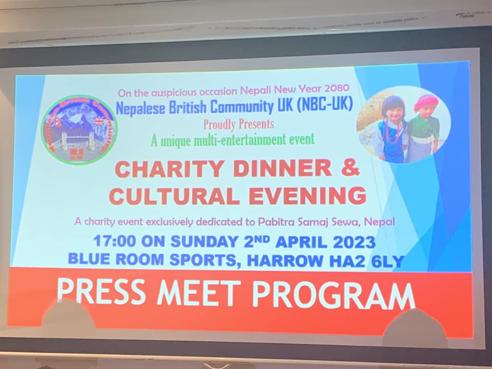 एनबीसी यूकेले नेपाली नयां वर्ष २०८० का अवसरमा राष्ट्रिय कलाकार झिकाएर कार्यक्रम गर्न लागेको हो । आइतबार लन्डन साउथ हयारोस्थित गोल्डेनसीप रेष्टुरेन्टमा आयोजित पत्रकार सम्मेलनमा एनबीसी यूकेका सचिव रविन्द्र अधिकारीले नेपालस्थित पवित्र समाज सेवाको सहयोगार्थ ब्लु रुम स्पोर्टस् भेन्यू हयारोमा च्यारिटी तथा सांस्कृतिक कार्यक्रम हुन लागेको जानकारी दिए ।