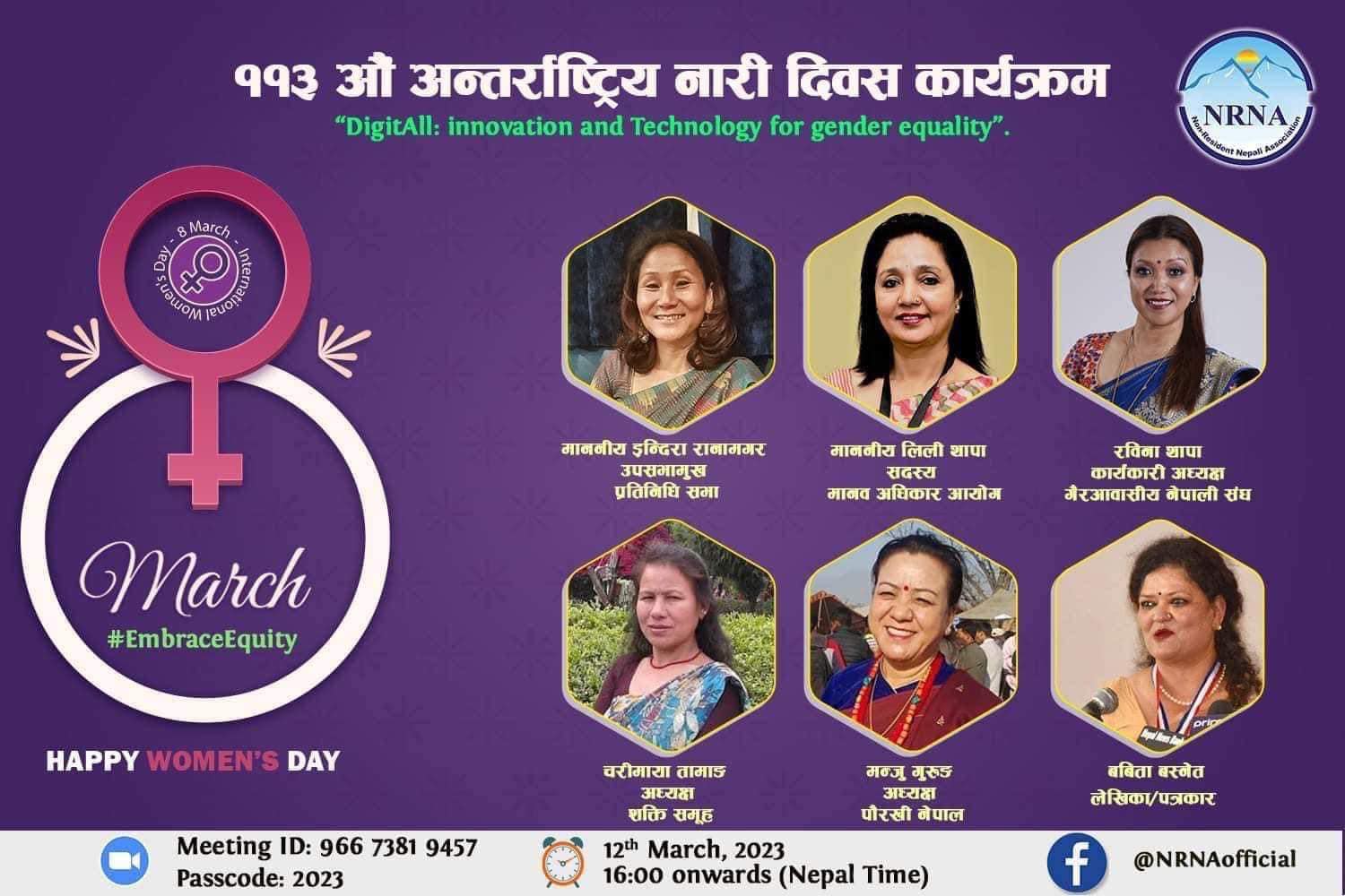 संघकी सचिव राधिका गुरुङका संघको महिला विभागले दिउसो ४ बजे पछि भर्चुअल कार्यक्रमको आयोजना गर्न लागेको हो । उपसभामुख ईन्दीरा राना मगरको प्रमुखआतिथ्यमा आयोजना हुने ११३ औं नारी दिवसलाई संघकी अध्यक्ष रविना थापा, मानवअधिकार आयोगकी। सदस्य लिली थापा, शक्ति समूहकी अध्यक्ष चरीमाया तामाङ, पौरखी नेपालकी अध्यक्ष मन्जु गुरुङ र पत्रकार बबिता बस्नेतले सम्बोधन गर्ने भएका छन् ।