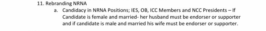 कार्यकारी अध्यक्ष डा. बद्री केसीको अध्यक्षतामा बस्न लागेको बैठकको ११ नम्बरमा रिब्राण्डीङ एनआरएनए अन्तर्रगत संघको निर्वाचनमा उठ्ने उम्मेदवार बन्नका लागि नयां योग्यता प्रस्ताव गरिएको छ । नयां प्रावधान अनुरुप संघको निर्वाचनमा उम्मेदवार बन्न श्रीमान वा श्रीमति एक जनाको अनिवार्य प्रस्तावक रहनु पर्ने व्यवस्था अघि सारिएको छ ।