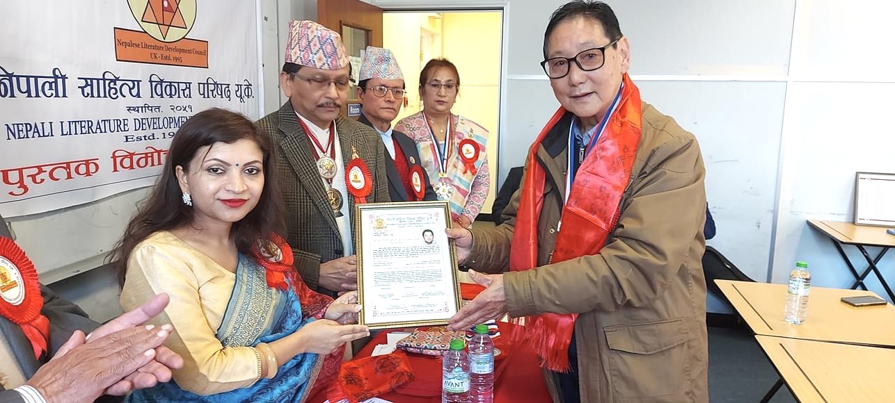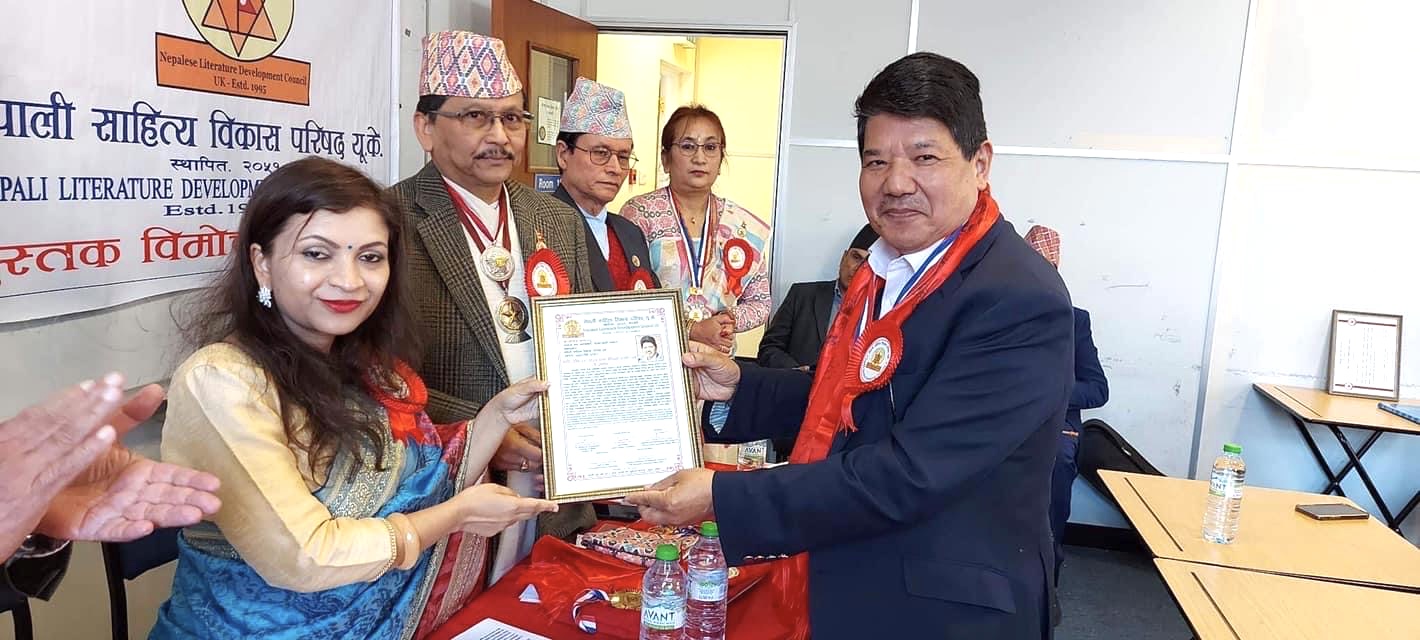 साथै उनले बेलायतमा विगत तीन दशक भन्दा बढी समयदेखि नेपाली गीत संगीत क्षेत्रमा निरन्तरयोगदान पुरयाउंदै आएका कोशेली नेपाली सांस्कृतिक परिवार यूकेका पूर्व वाद्यवादन विभाग प्रमुख कलाकार डम्बर सुव्वालाई ‘विशिष्ट नेपाली कला साहित्य सम्मान पुरस्कार पदक’ प्रदान गरिन् ।
