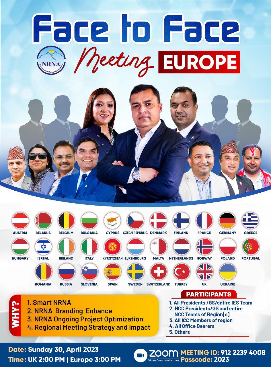गैरआवासीय नेपाली संघका उपमहासचिव रामशरण सिमखडाका अनुसार संघले अप्रील ३० तारिख युरोपेली मुलुकमा रहेका राष्ट्रिय समितिहरुसंग ‘फेस टु फेस’ बैठकको आब्हान गरेको हो । भरर्चुअल मार्फत हुने सो बैठकमा स्मार्ट एनआरएनए, ब्राण्डिङ्ग, मेघा परियोजना र आगामी युरोप वैठक बारेमा छलफल हुने बताइएको छ ।