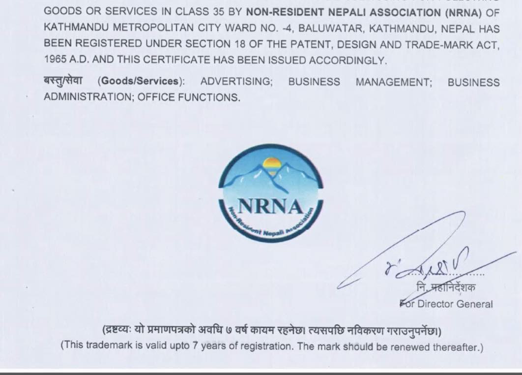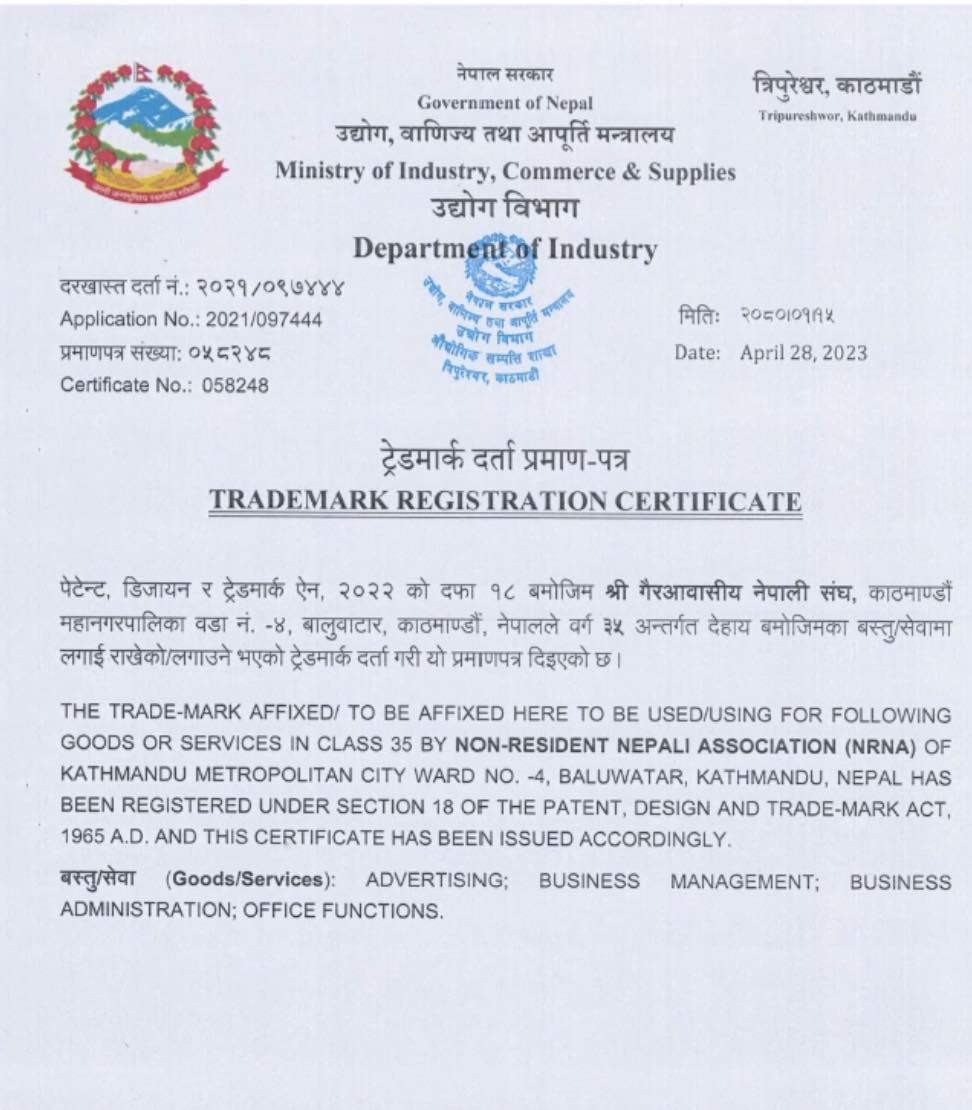 लण्डन । गैरआवासीय नेपाली संघ ट्रेडमार्कमा दर्ता भएको छ । गैरआवासीय नेपाली संघ (एनआरएनए) का उपमहासचिव रामशरण सिमखडाका अनुसार संघले उद्योग, वाणिज्य तथा आपूर्ति मन्त्रालय अन्तरगर्त उद्योग विभागबाट ट्रेडमार्क प्रमाणपत्र प्राप्त गरेको हो । संघले पेन्टेन्ट, डिजायन र ट्रेडमार्क ऐन २०२२ को दफा १८ बमोजिम आफ्नो ट्रेडमार्क सुरक्षित गरेको हो ।