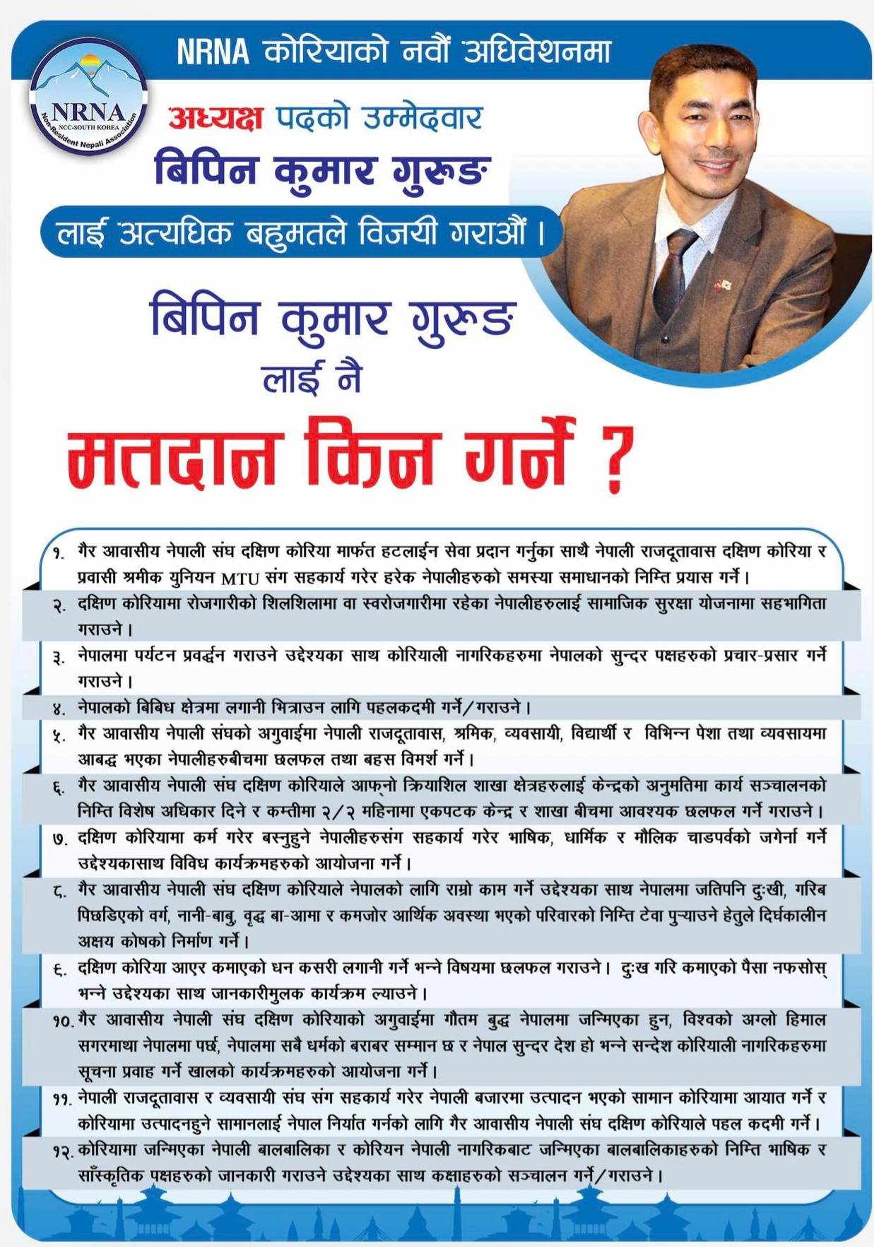 अध्यक्षमा आफ्नो उम्मेदवारी बारे विपिन भन्छन्–‘मेरो अनुभव, कोरियामा रहेका नेपालीहरुको समर्थन र मेरो संस्थामा रहेर कार्य गर्ने इच्छा शक्तिले सबैको मन जित्ने छु र एनआरएनए कोरियालाई अर्को उचाईमा पु-याउने छु ।’