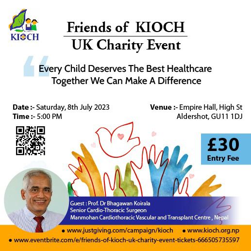 कियोच युके सहयोग समितिका संयोजक ओजेश सिंहले नेपालको बाल अस्पताल परियोजनाहरुलाई सघाउन यही शनिबार, ८ जुलाई, मा बेलायतको अल्डरशटमा एक च्यारिटी डिनरको आयोजना गरिएको भन्दै उक्त कार्यक्रममा सहभागी भै सक्दो सहयोग गर्न सबैलाई आग्रह गरेका छन् ।