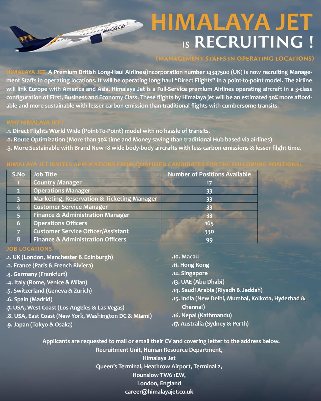 उक्त एयरलाइन्सले ५५ क्याप्टेन र ५५ कोपाइलटका लागि दर्खास्त पनि आह्वान गरेको छ। त्यस्तै थप २५०० कर्मचारी भर्ना गरिने पनि कम्पनीले जानकारी दिएको छ।