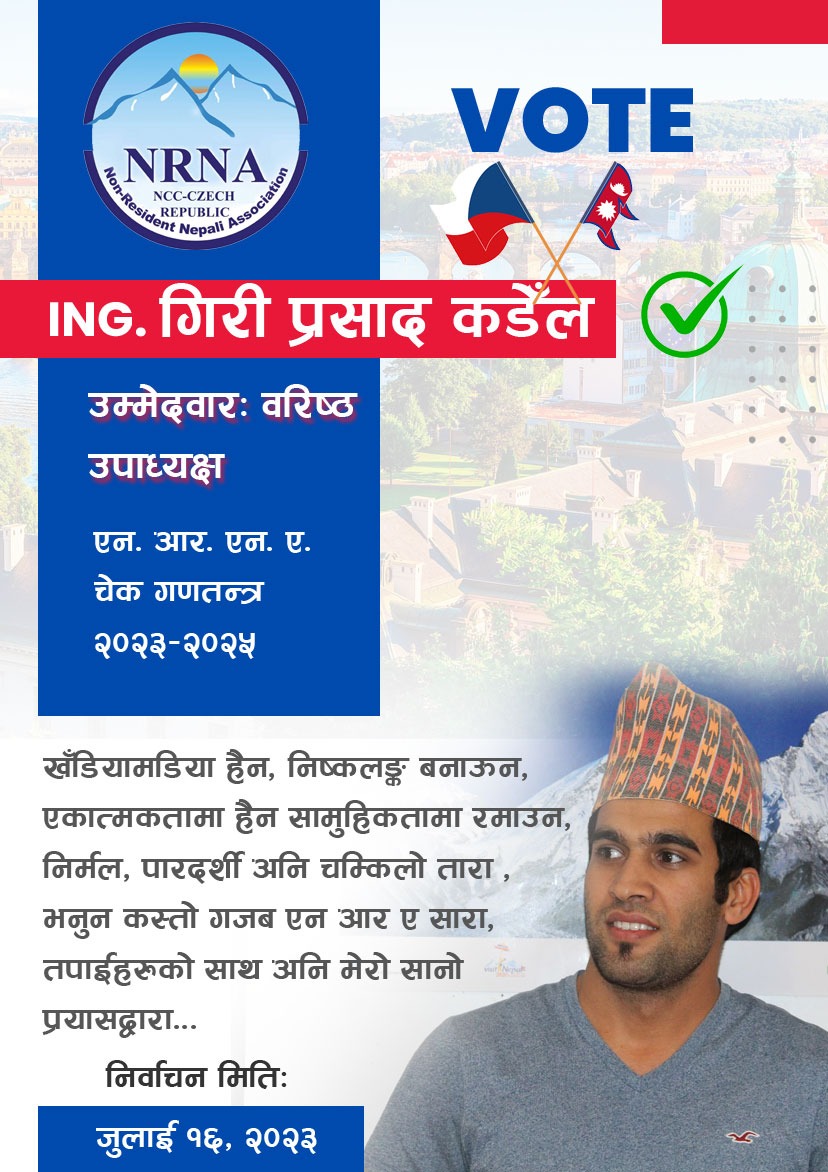 लण्डन्। गैरआवासीय नेपाली संघ चेक गणतन्त्रको वरिष्ठउपाध्यक्षमा गिरी प्रसाद कंडेलले उम्मेदवारी दर्ता गरेका छन् ।