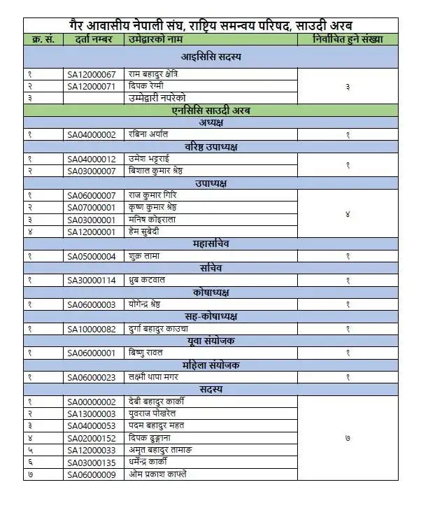 अन्य पदका उमेदवारको सम्वन्धमा गैरआवासीय नेपाली संघ राष्ट्रिय समन्वय परिषद साउदी अरबको नवौँ राष्ट्रिय महाधिबेशन बाट २०२३ – २०२५ कार्यकालको लागि बिधानको दफा १३.१ मा रहेका पदिय प्रावधान बमोजिम उम्मदेवारीहरू आह्वान गरिएकोमा निर्धारित मिति १५ जुलाई २०२३ सम्ममा प्राप्त उम्मेदवारीहरूको पहिलो सूची निर्वाचन समितिले प्रकाशन गरेको छ ।