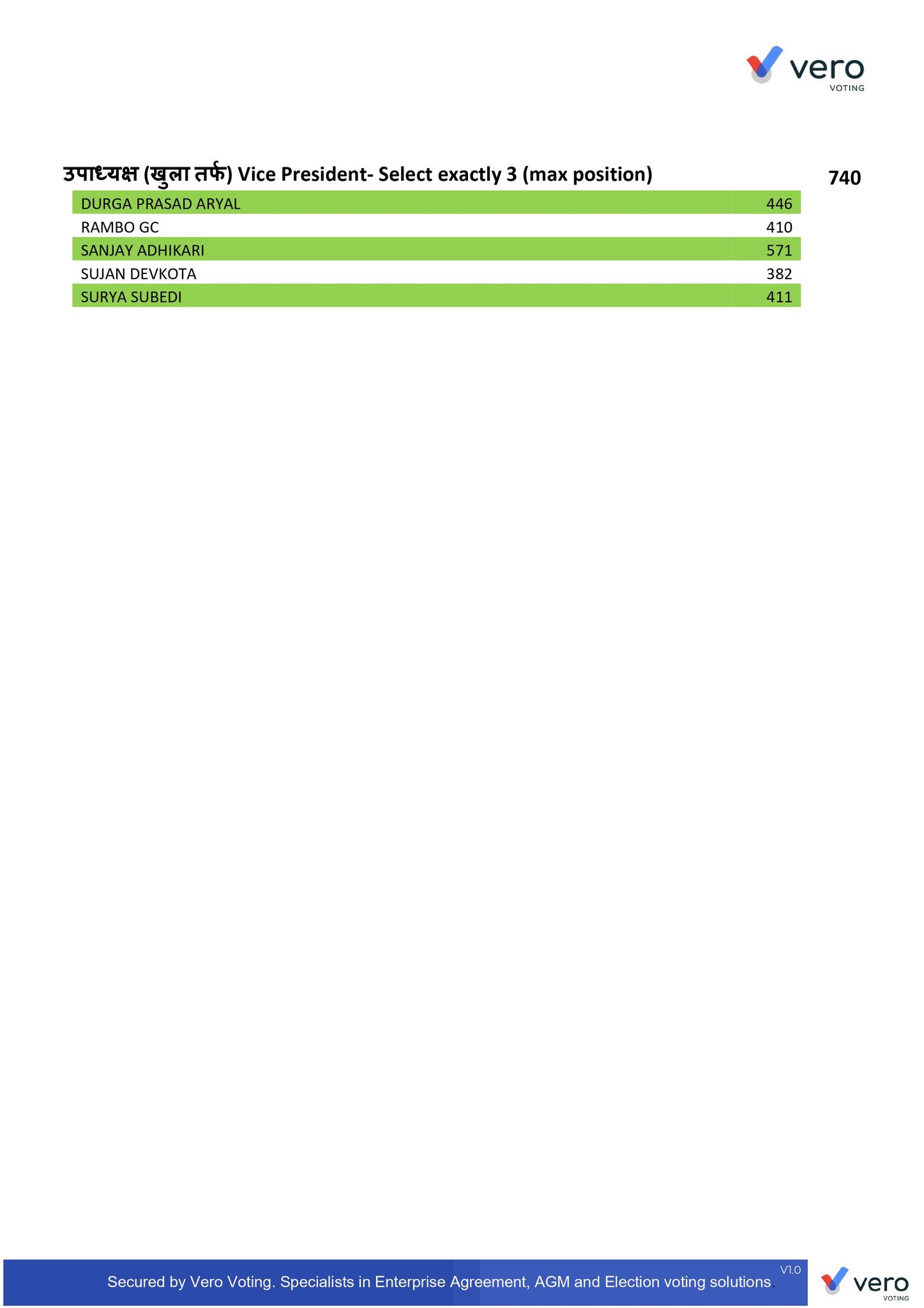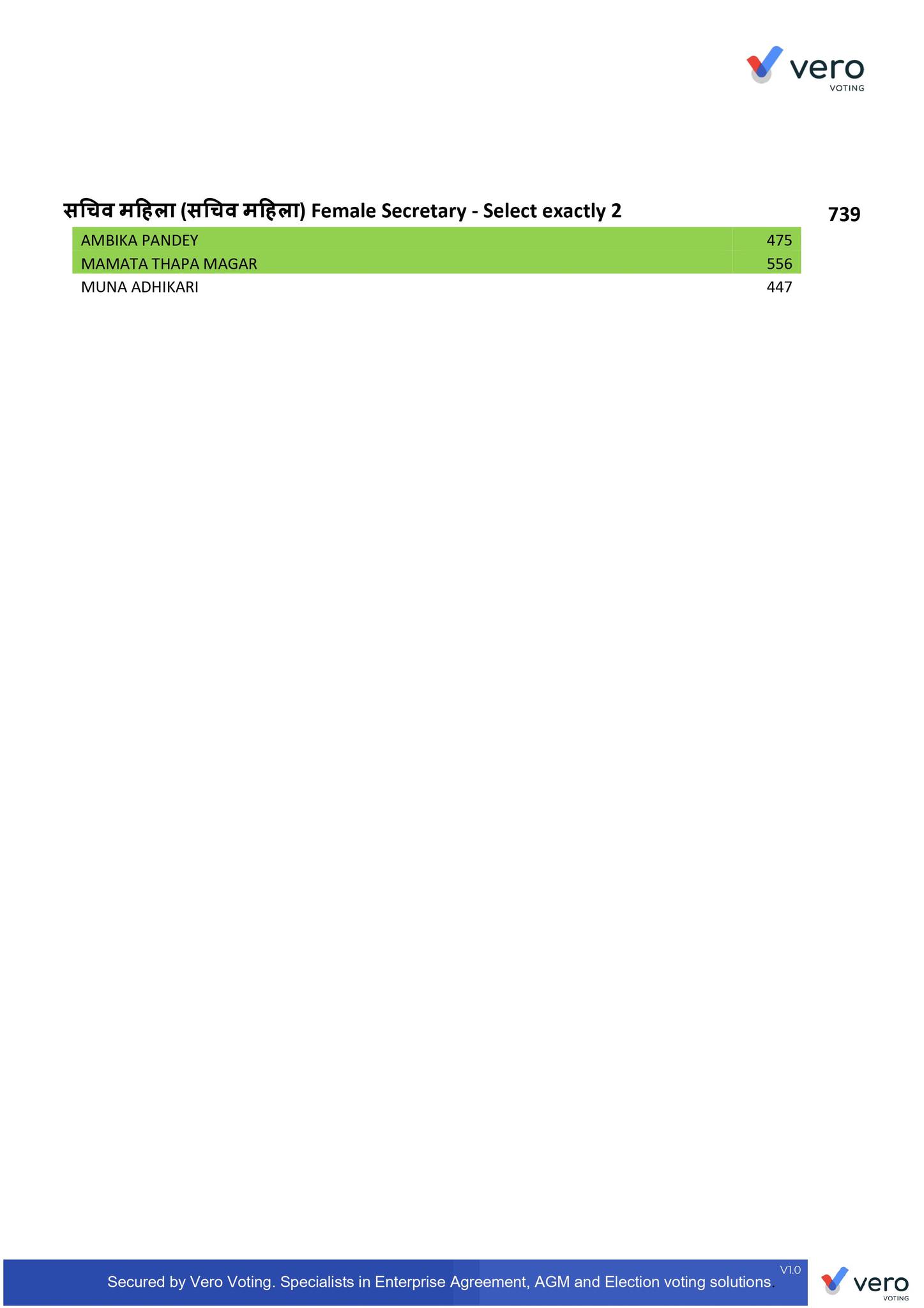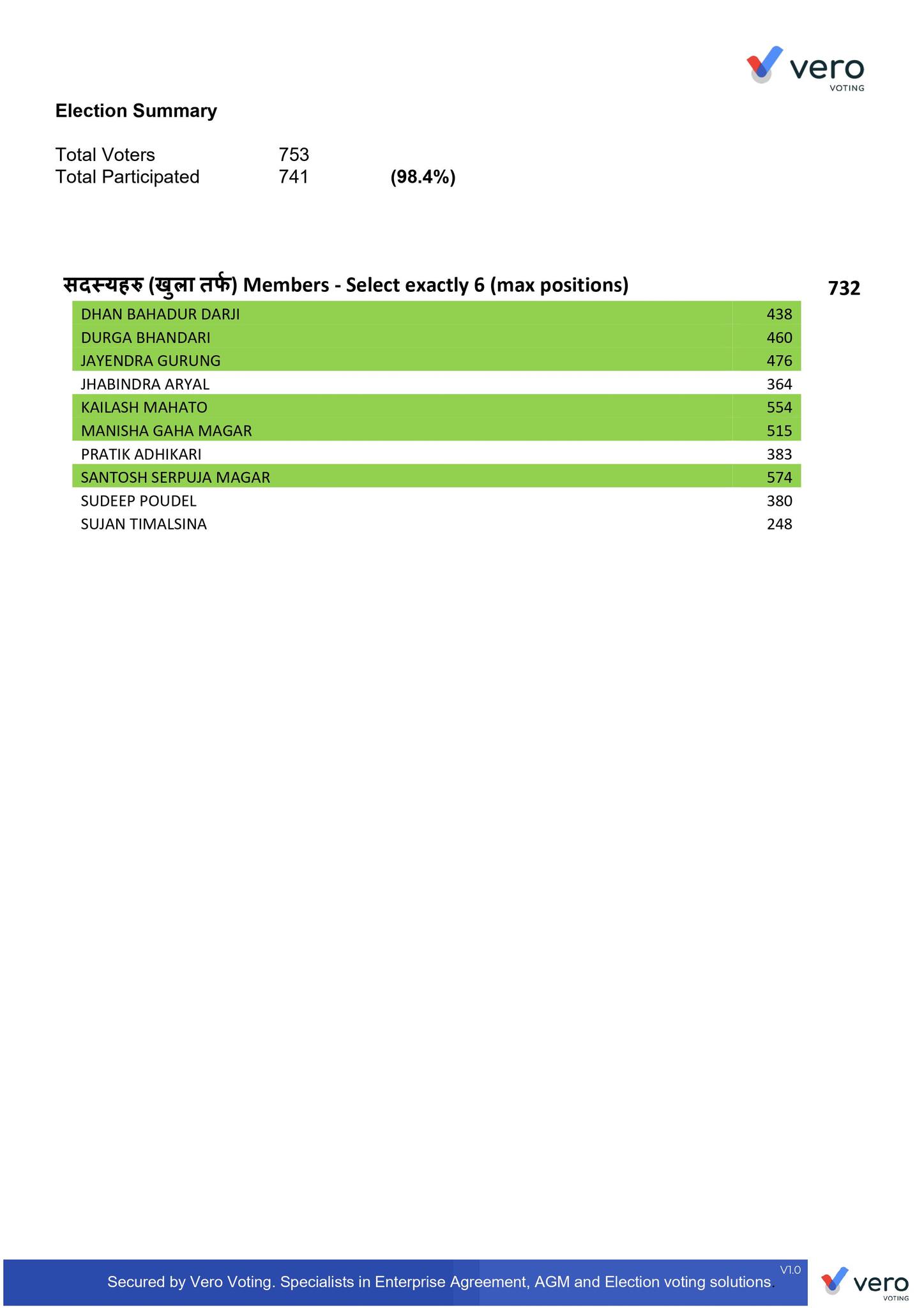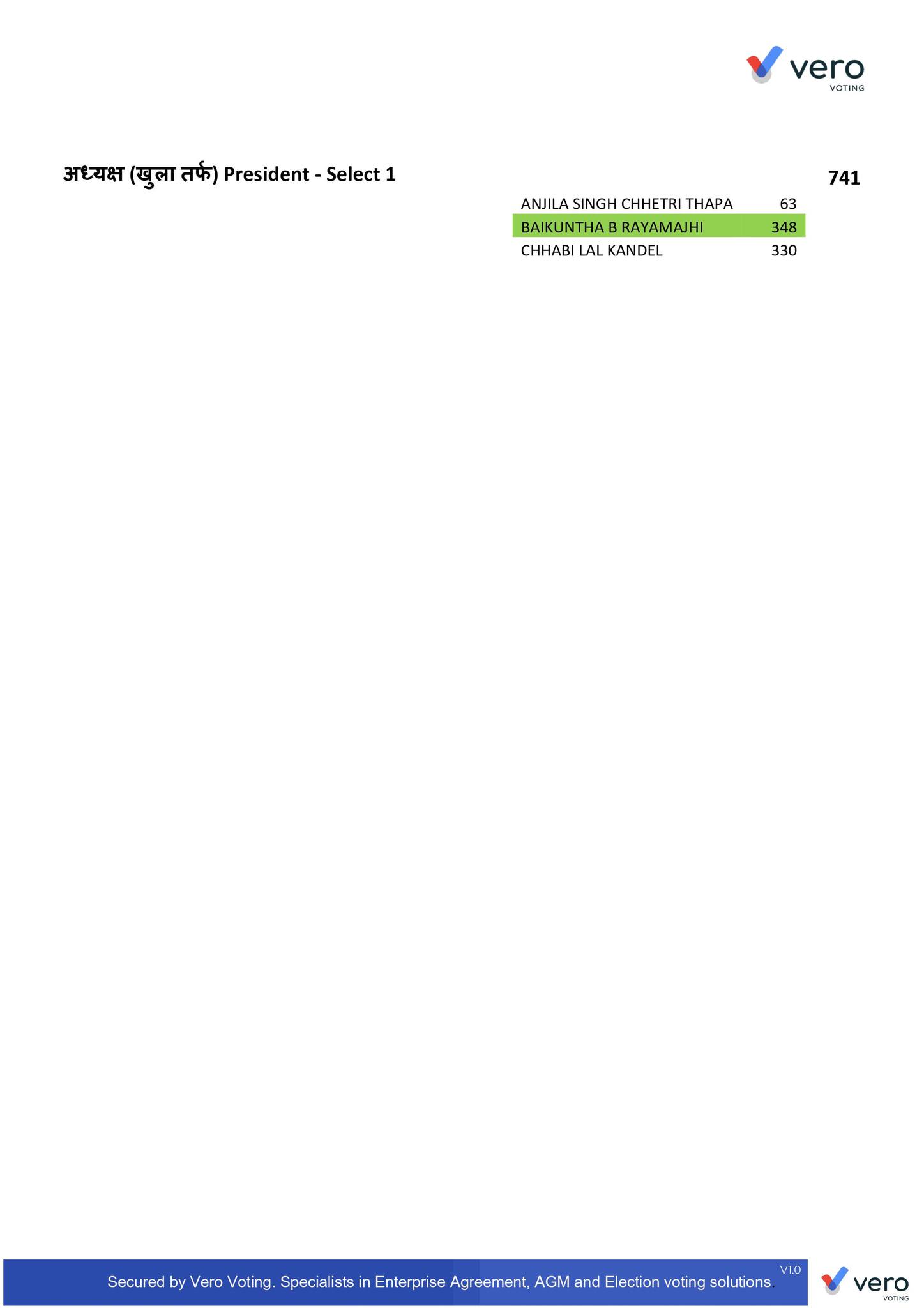 निर्वाचन सम्पन्न भएको ४५ मिनेटमा अष्ट्रेलिय कम्पनी भेरो निर्वाचनमा परिणाम सार्वजनिक गरेको थियो । अध्यक्ष पदको लागि उम्मेदवार अन्जिला सिंह थापा क्षेत्रीले ६३ र छविलाल कंडेलले ३३० मत प्राप्त गरे ।