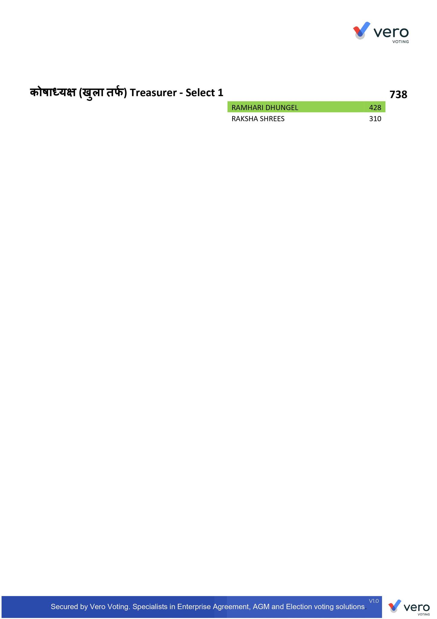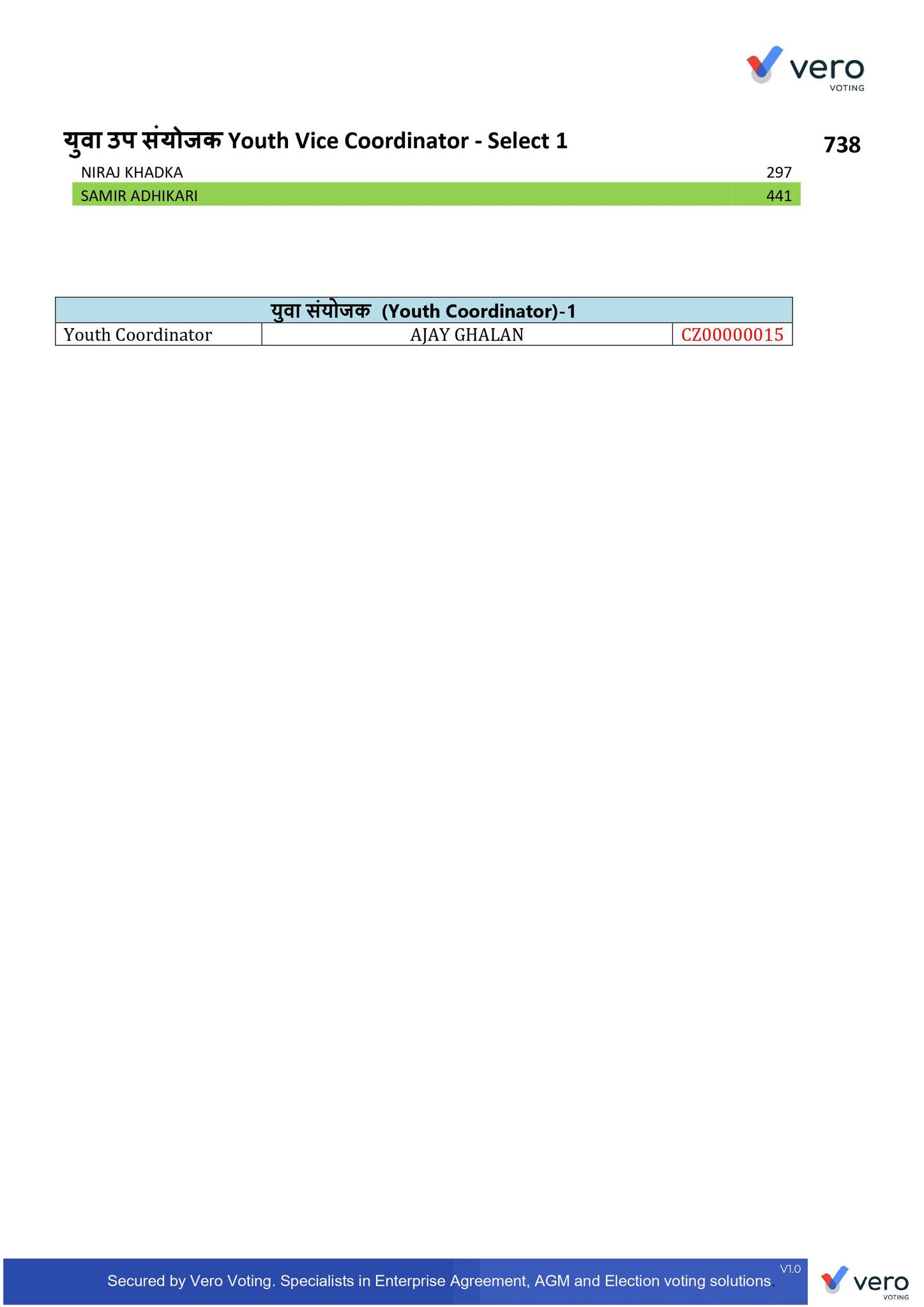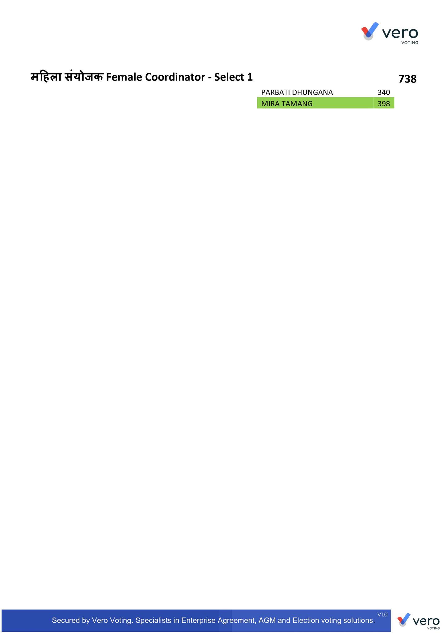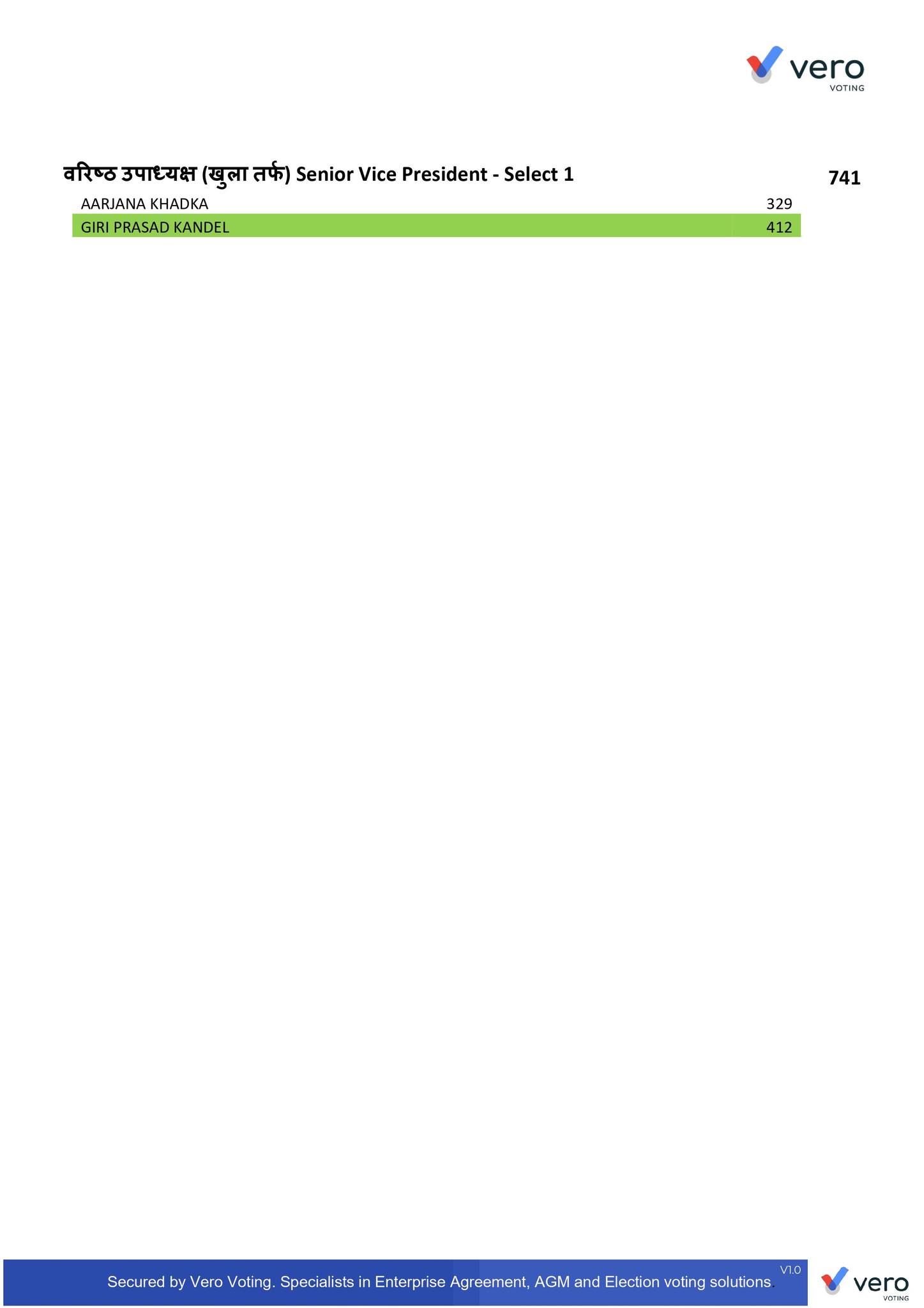 निर्वाचन सम्पन्न भएको ४५ मिनेटमा अष्ट्रेलिय कम्पनी भेरो निर्वाचनमा परिणाम सार्वजनिक गरेको थियो । अध्यक्ष पदको लागि उम्मेदवार अन्जिला सिंह थापा क्षेत्रीले ६३ र छविलाल कंडेलले ३३० मत प्राप्त गरे ।
