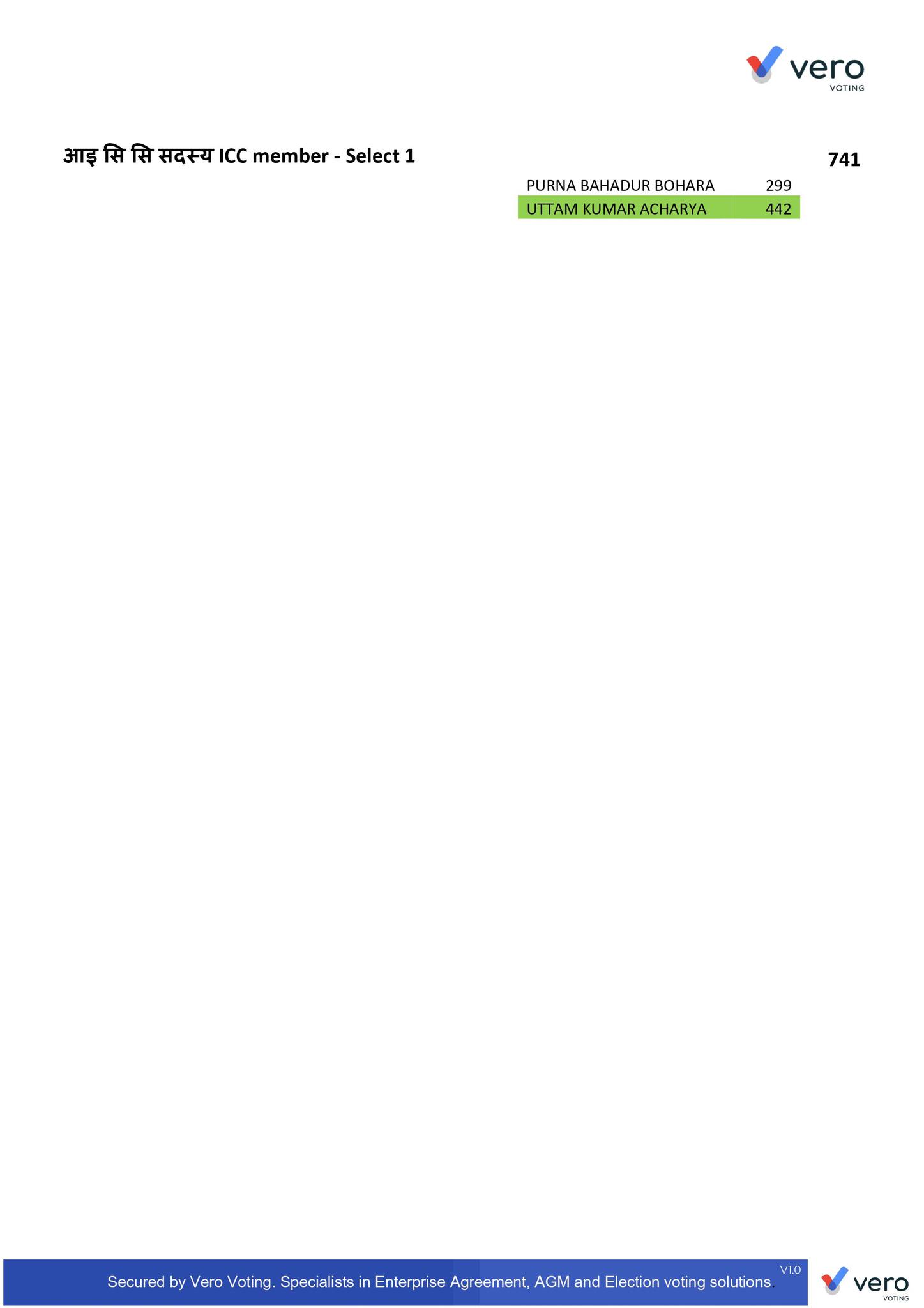 आइसीसी सदस्यमा उत्तम कुमार आचार्यले ४४२ मत प्राप्त गरे । निर्वाचन सम्पन्न भएको ४५ मिनेटमा अष्ट्रेलिय कम्पनी भेरो निर्वाचनमा परिणाम सार्वजनिक गरेको थियो ।