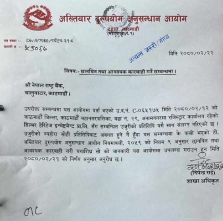 अख्तियारले नेपाल राष्ट्र बैंकलाई गत जेठमै पत्र पठाएर आयोगमा दर्ता भएको उजुरीका आधारमा यस सम्बन्धमा के कसो भएको हो ? तत्काल जानकारी उपलब्ध गराउन अनुरोध गरेको छ ।