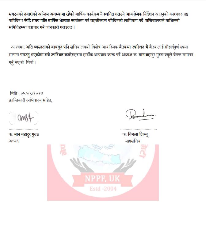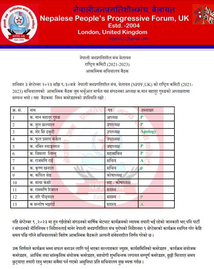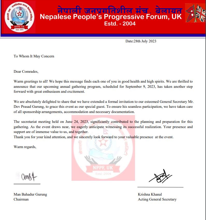 आगामी शनिबार (२३ भदौ) नेकपा माओवादी केन्द्रको बेलायतस्थित प्रवासी संगठन नेपाली जनप्रगतिशील मञ्चको वार्षिक कार्यक्रम हुँदै थियो।