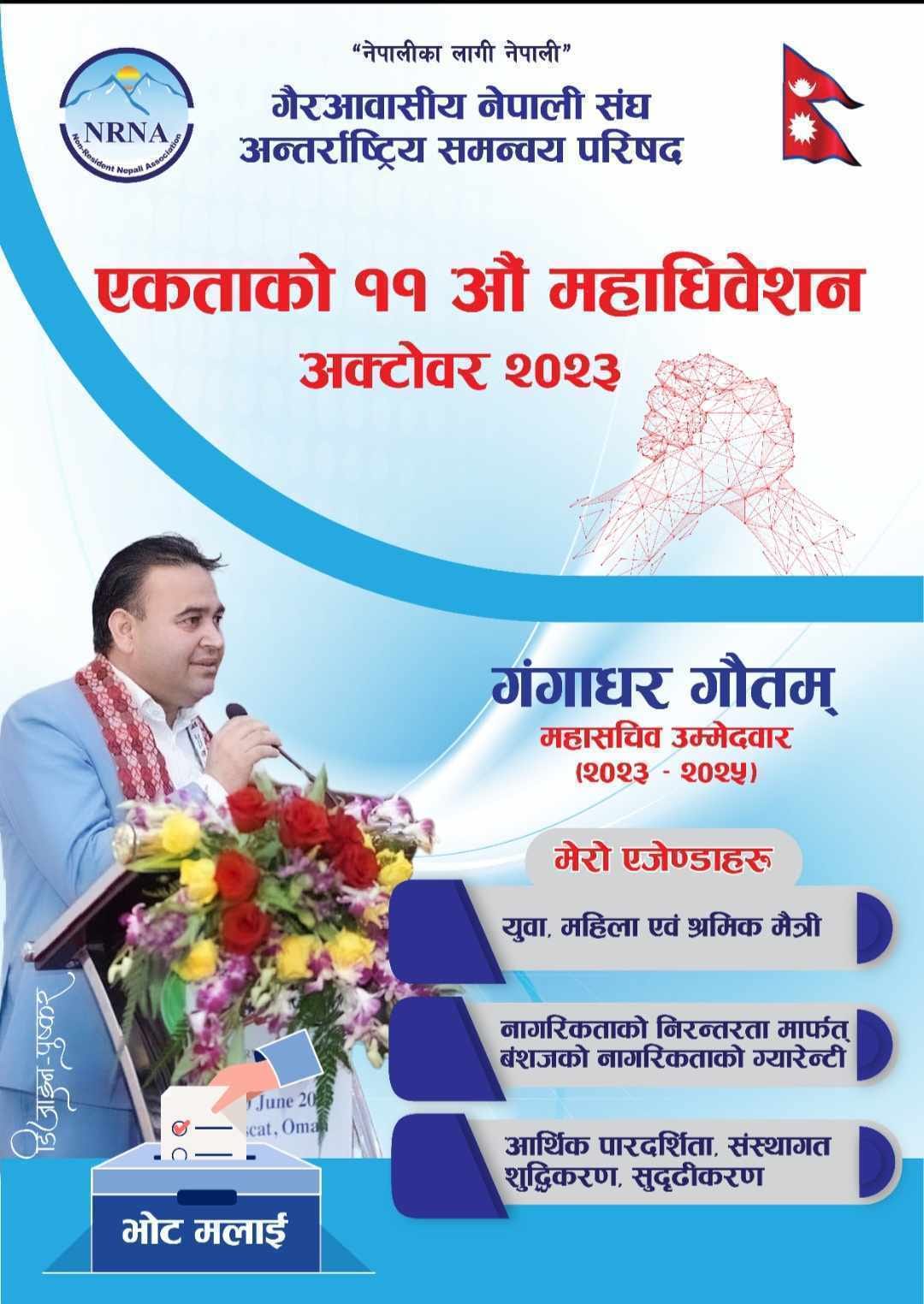 विभिन्न एनआरएन अभियन्ताहरुले विभिन्न पदमा उम्मेदवारी घोषणा गर्ने क्रममा बेल्जियम बसोबास गर्ने एनआरएनए ग्लोबल सचिव गंगाधर गौतमले पनि महासचिव पदका लागि उम्मेदवारी घोषणाको तयारी गरेका छन् । विगत दुई दशकदेखि बेल्जियमलाई कर्मथलो बनाउँदै आएका बाग्लुङ गल्कोटमा जन्मेका गौतमले आफूलाई महासचिव पदमा उभ्याउने भएका हुन्।