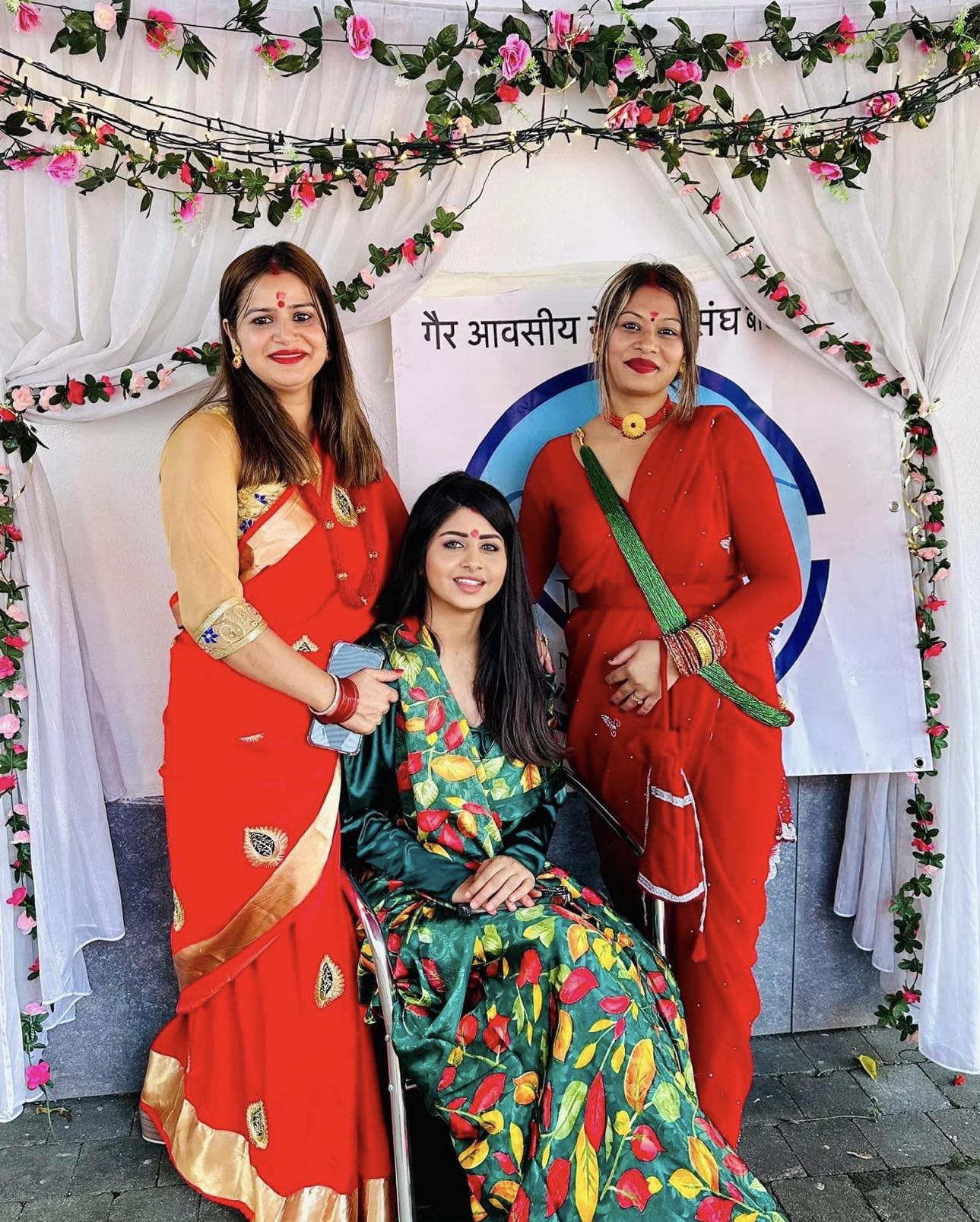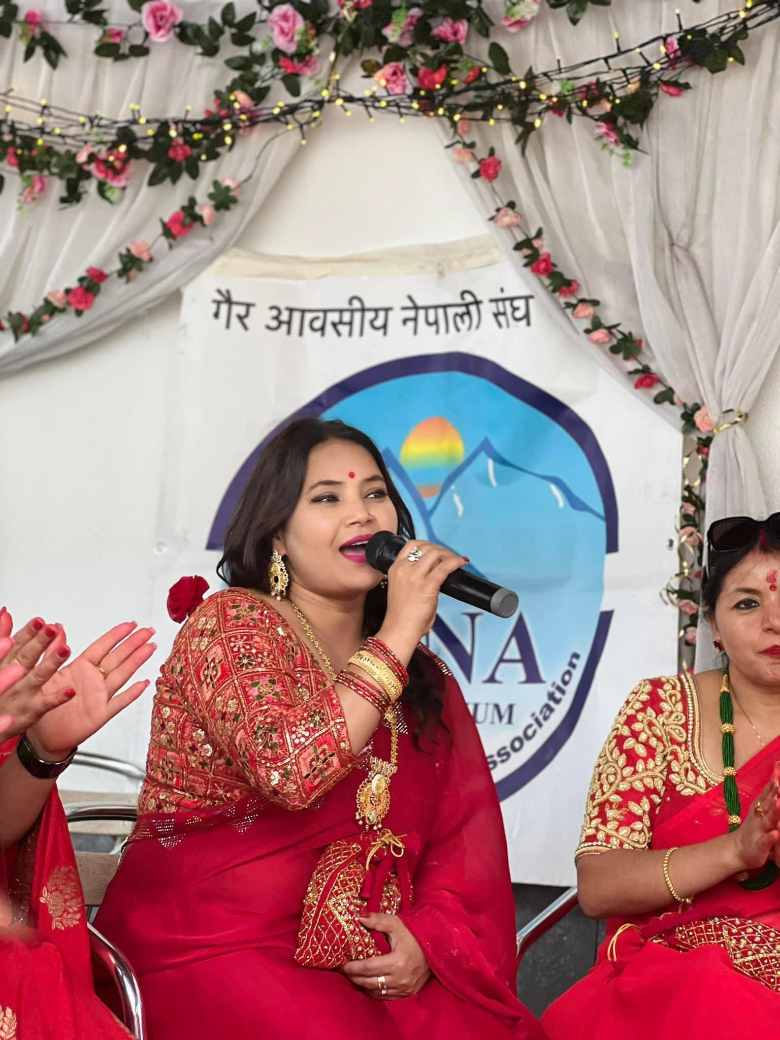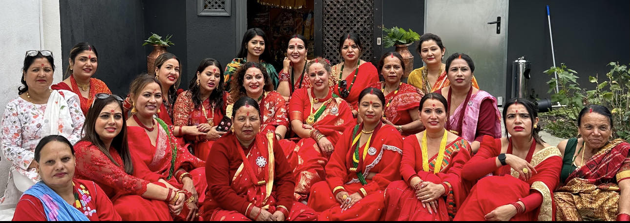 स्थानीय अन्नपूर्ण रेष्टुरेन्टमा आयोजित कार्यक्रममा रातो साडी, चुरा, पोते लगाएका महिलाहरूको समूह, तस्बिर र भिडियोहरूले नेपाललाई बिर्साएको छ।