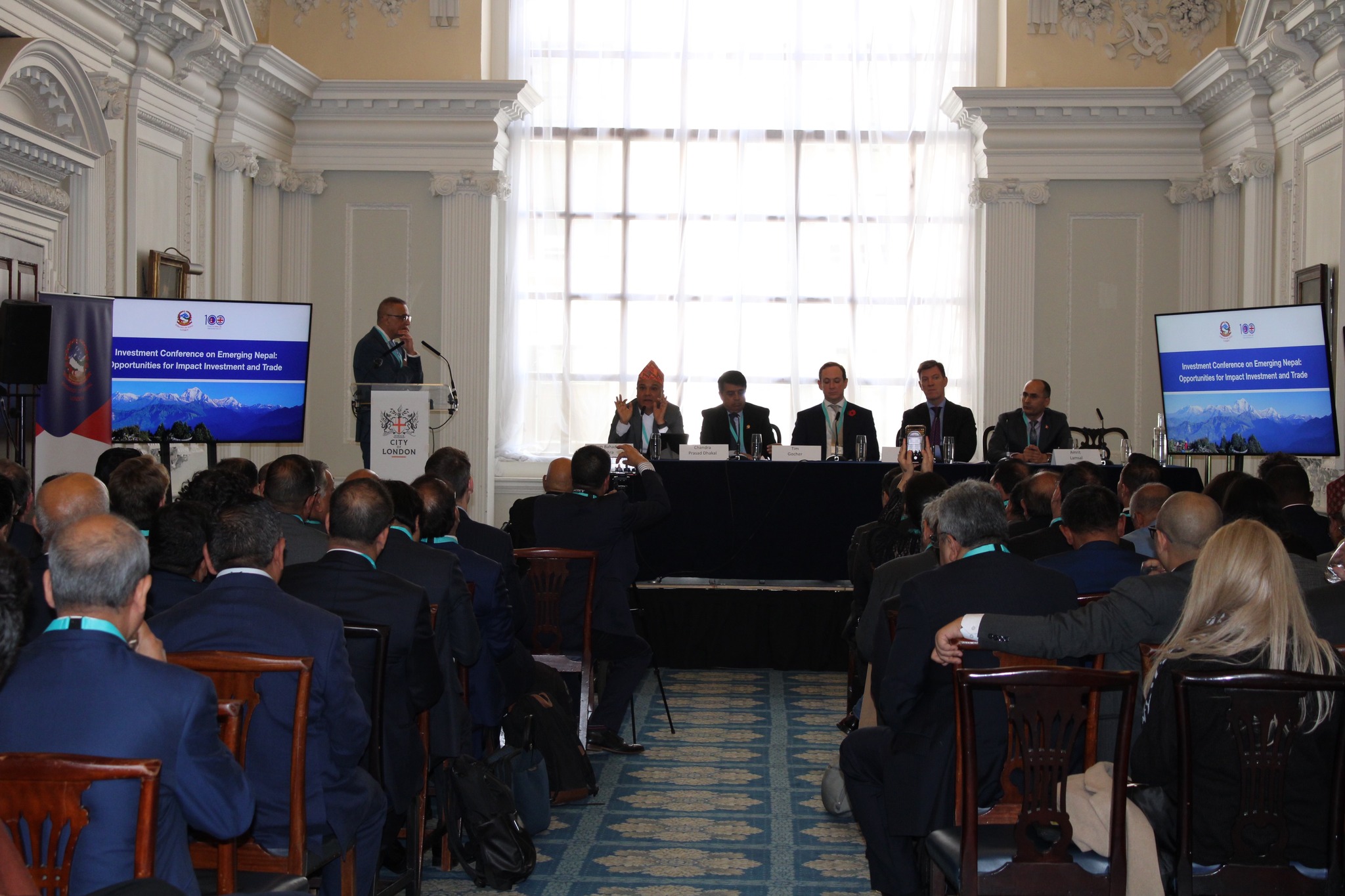 उक्त सम्मेलनलाई प्रमुख वक्ताको रुपमा सम्बोधन गर्दै माननीय अर्थमन्त्री डा. प्रकाशशरण महतले नेपालको समृद्धि र आर्थिक रुपान्तरणका लागि ठूलो वित्तीय श्रोतको आवश्यकता रहेको जनाउँदै त्यसका लागि आन्तरिक श्रोत पर्याप्त नहुने भएकोले वैदेशिक लगानी अपरिहार्य रहेको बताउनुभयो। नेपाल सरकारले लगानी मैत्री वातावरणका लागि आवश्यक ऐन, कानून निर्माण तथा परिमार्जन एवं संस्थागत व्यवस्था गरेको र यस वर्षको बजेटले लगानीकर्तालाई थप सहजीकरण गर्न बिभिन्न सुधारका कार्य शुरु गरेको समेत बताउनुभयो। उहाँले अन्तर्राष्ट्रिय वित्त बजारबाट पुँजी परिचालन गर्न आवश्यक कानूनी पूर्वाधार तयार गरिने जानकारी दिंदै आगामी दिनमा बेलायतबाट लगानीमा थप वृद्धि हुने विश्वास व्यक्त गर्नुभयो।