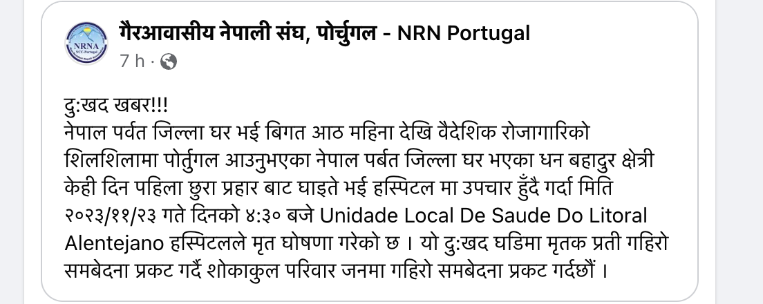 लण्डन । पोर्तुगलमा छुरा प्रहारबाट एक जना नेपालीको हत्या भएको छ । गैरआवासीय नेपाली संघ पोर्तुगलका अनुसार पर्वत जिल्ला घर भई विगत ८ महिना देखि पोर्तुगल बस्दै आएका धन बहादुर क्षेत्रीको हत्या भएको हो ।