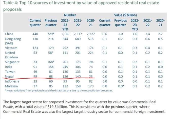 अष्ट्रेलियाको ट्रेजरी डिपार्टमेन्टले यसैसाता सार्वजनिक गरेको वैदेशिक लगानी सम्बन्धी प्रतिवेदनमा अष्ट्रेलियाको घर–जग्गा व्यवसायमा नेपालीको ठूलो लगानी रहेको देखिएको हो । ट्रेजरी डिपार्टमेन्ट अष्ट्रेलियाको विदेशी लगानी नियामक निकाय हो ।