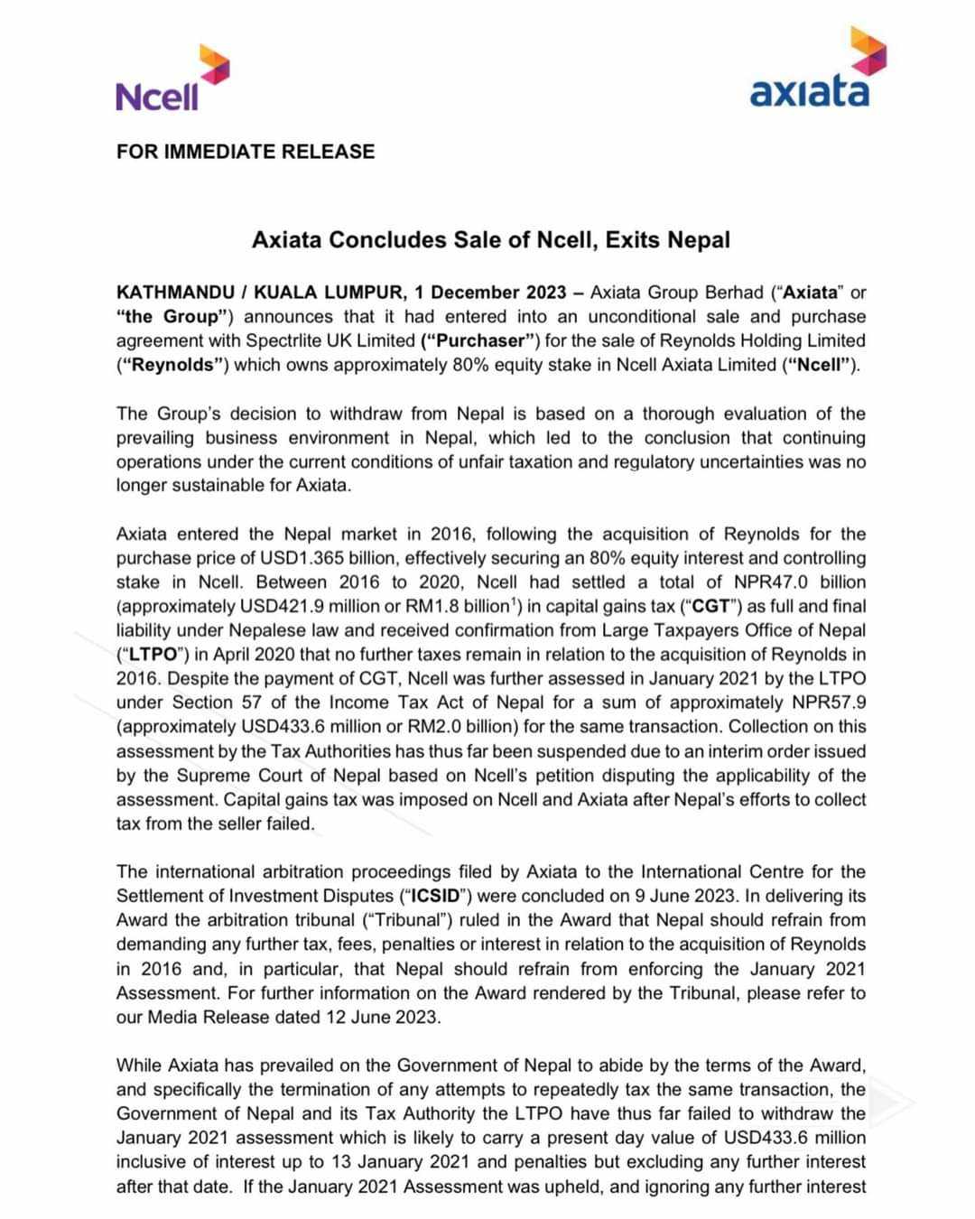 “Ncell retains full responsibility for its business and any of its liabilities, while the purchaser will further indemnify Axiata against existing and future Nepalese tax claims in relation to Ncell.