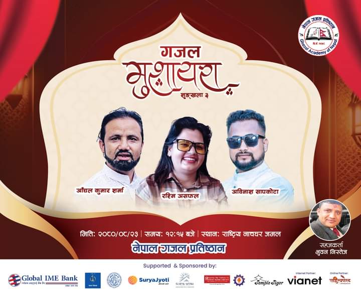 काठमाडौं । नेपाल गजल प्रतिष्ठानले हरेक २ महिनामा आयोजना गर्दै आएको ‘गजल मुशायरा’ मा यस पटक ३ जना गजल स्रष्टा प्रस्तुत हुँदैछन् । मङ्सिर २३ गते शनिबार राष्ट्रिय नाचघर जमलमा गजलकारहरू रश्मि असफल, आँचलकुमार शर्मा र अविनासु सापकोटाले सुन्दर र सशक्त गजल प्रस्तुत गर्ने आयोजकले बताएको छ ।